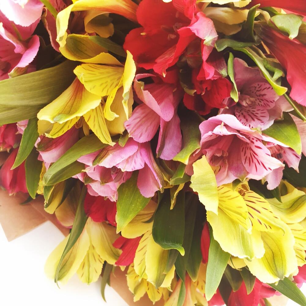 Лента атласная – 2 шт.Упаковка дизайнерская – 3 шт.Открыточка с вашими пожеланиями – 1 шт.Альстромерия Микс Европа – 15 шт.любовь флориста (бесплатно) – 1 шт.