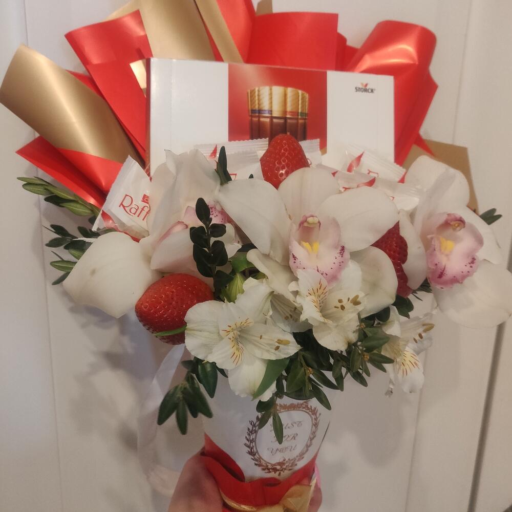 Альстромерия – 3 шт.Клубника – 250 гр.орхидея – 3 шт.Упаковка дизайнерская – 1 шт.Конфеты мерси 250 гр – 1 шт.раффаэлло 150 гр – 1 шт.