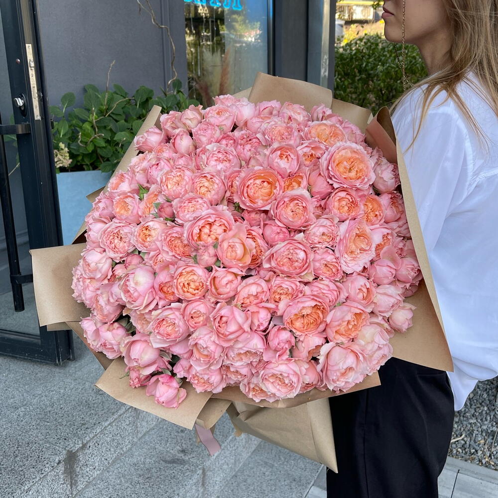 Піоновидна кущова троянда сорту Juliet в крафтовому пакуванні