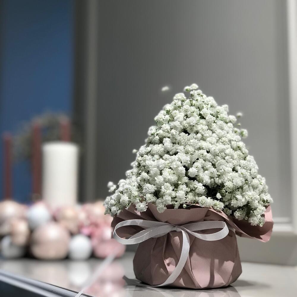 “Сиреневый туман” – композиция из гипсофилы в шляпной коробке