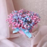 Лента атласная – 1 шт.Флористическая губка (оазис) – 1 шт.Гипсофила розовая – 2 шт.Гипсофила голубая – 1 шт.