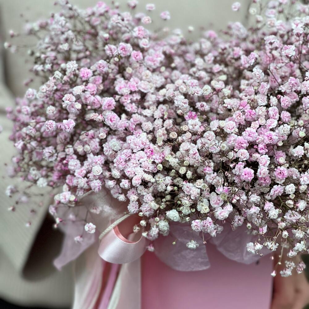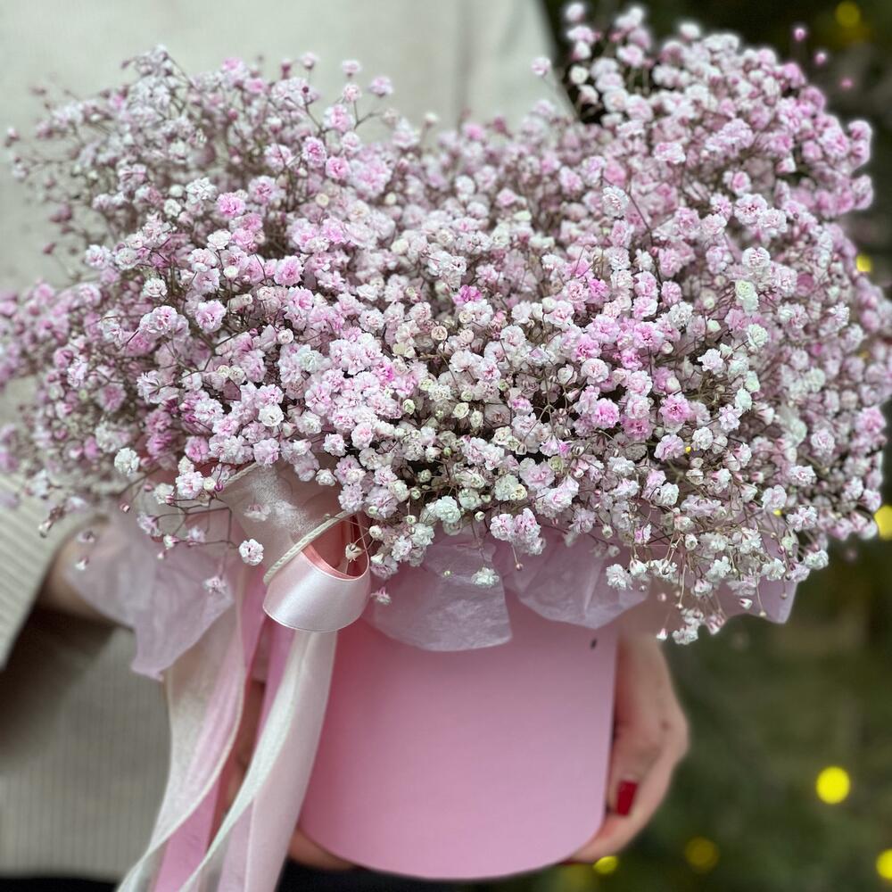Нежная, розовая гипсофила в коробке