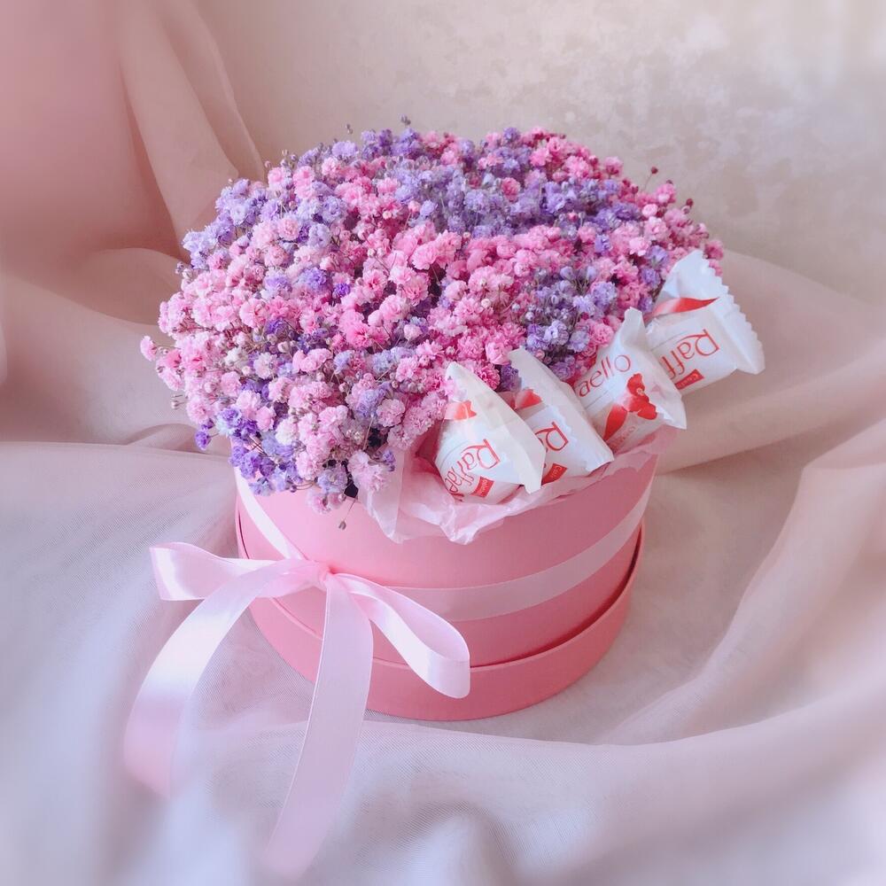 Очаровательная композиция из изысканных свежих цветов с конфетами Raffaello❤️Наполнена множеством соцветий радужной гипсофилы. Собрана в стильной шляпной коробке.Композиция из гипсофилы – необычный подарок, который удивит своей невероятной стойкостью, при правильном и простом уходе.❤️ Ставить композицию в прохладном месте, избегая отопительных приборов и прямых солнечных лучей. ❤️ Подливать немного воды в серединку.Гипсофила не вянет, а становится сухоцветом, сохраняя свой вид. Поэтому композиция продолжит радовать ещё очень долго!Почему выбирают нас? – Работаем на качество. – Бережно упакуем в транспортировочную пленку, чтобы защитить во время доставки от любых погодных условий. – Приложим инструкцию, как правильно ухаживать за цветамиСохраняйте товар в подборках, чтобы не потерять