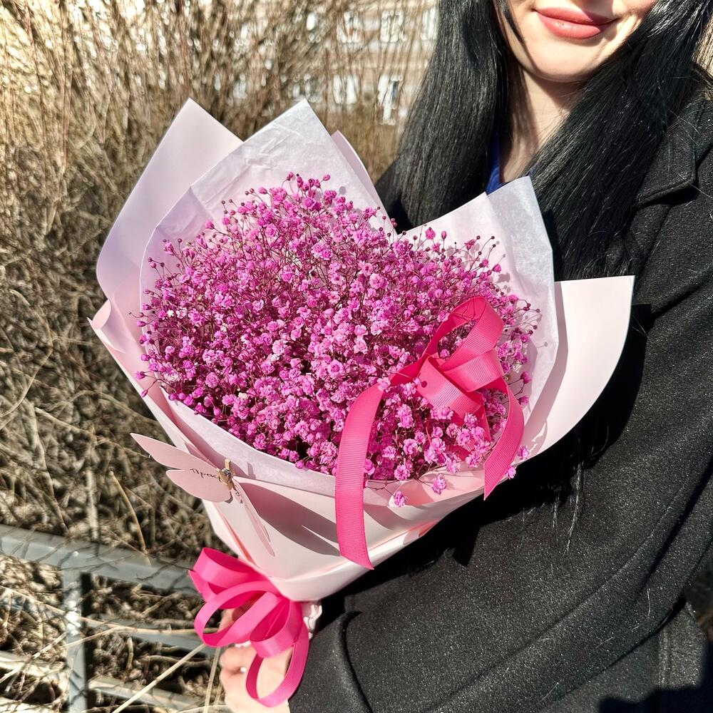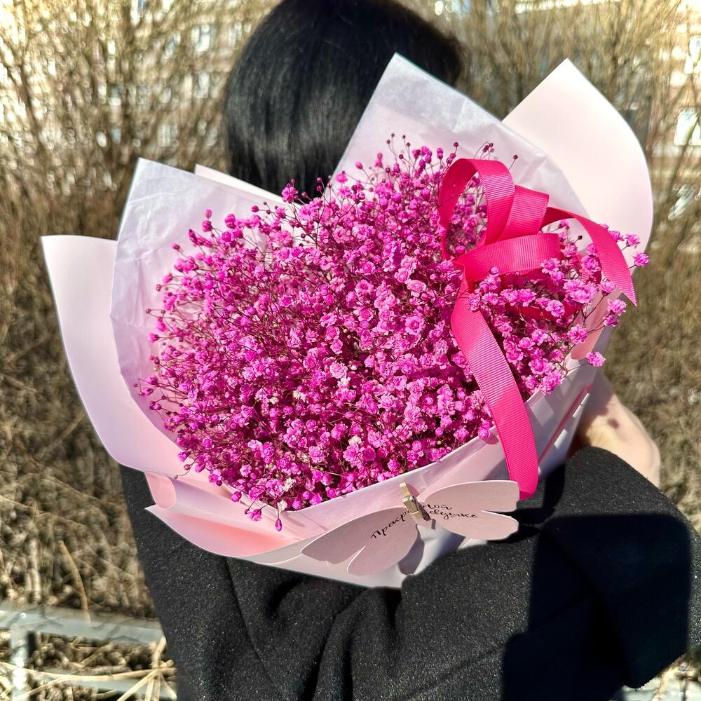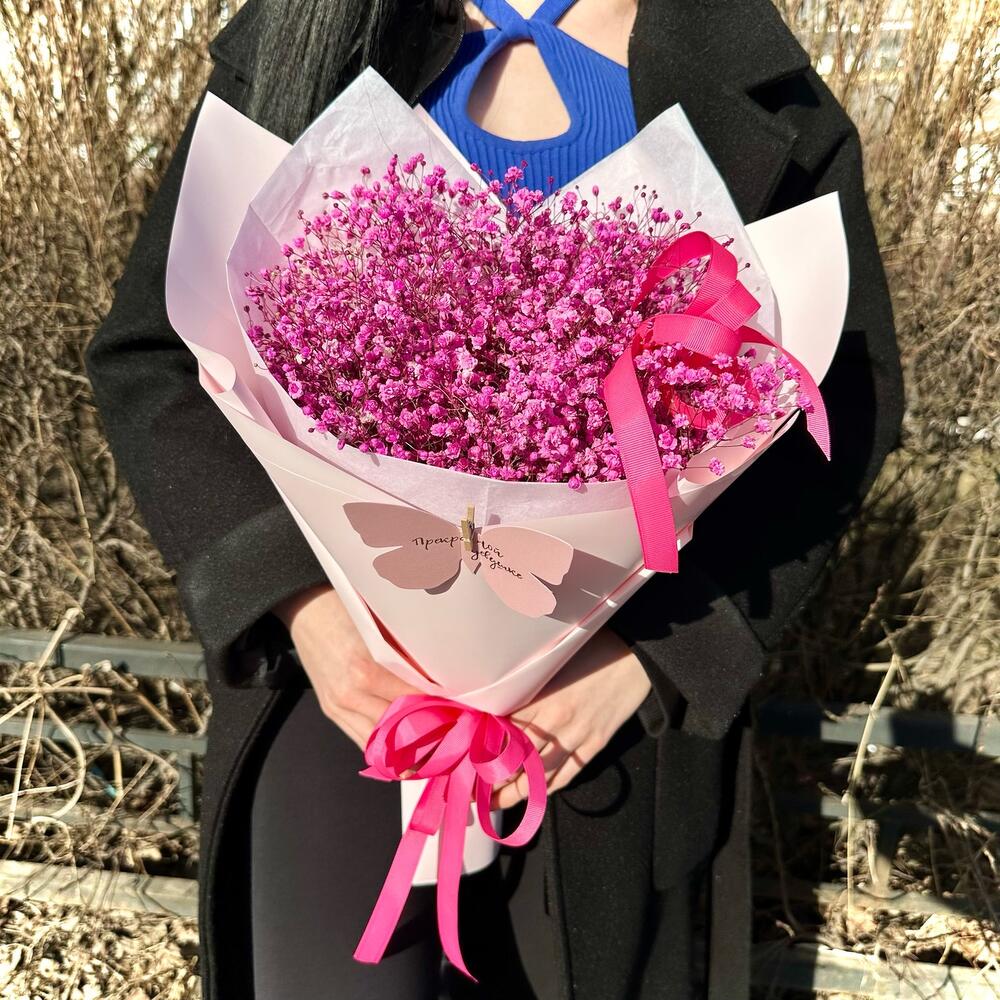 Лента атласная – 1 шт.Тишью – 1 шт.Пленка матовая – 1 шт.Открыточка с вашими пожеланиями – 1 шт.Гипсофила розовая – 7 шт.