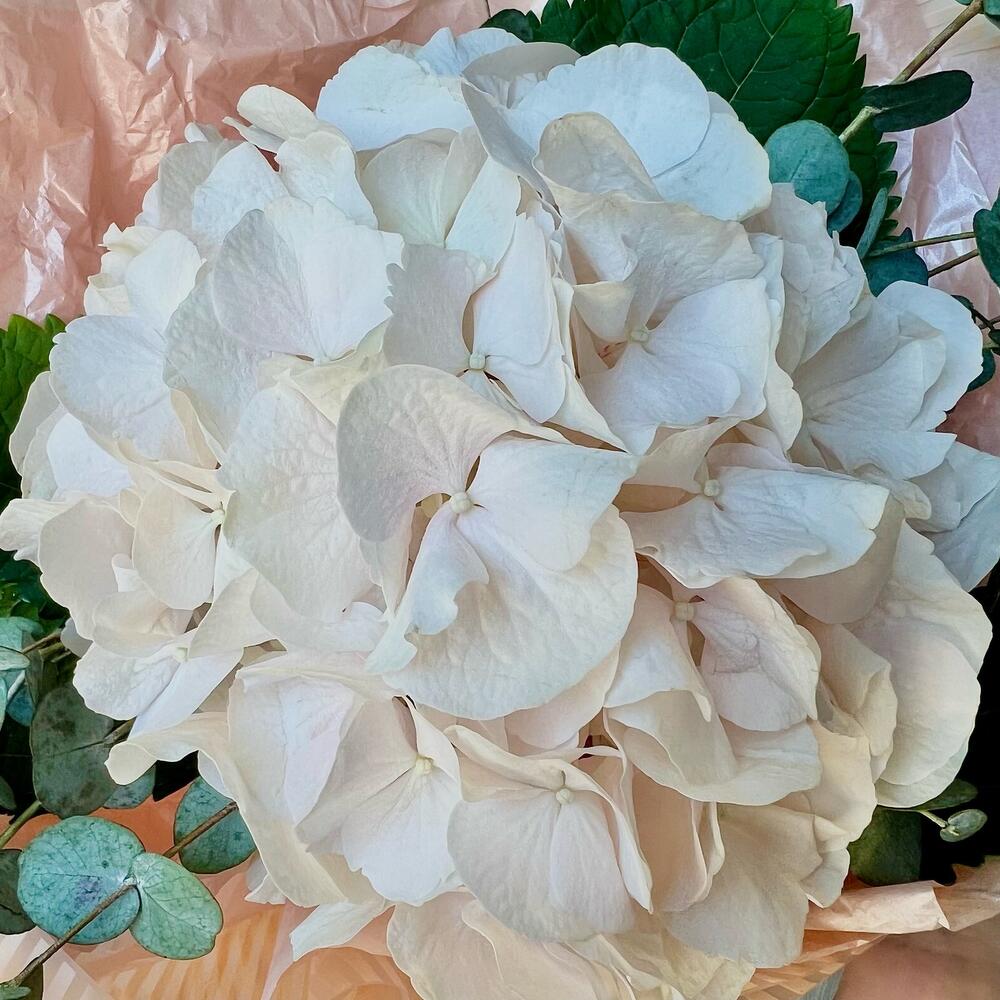 Гортензия – 1 шт.Эвкалипт – 2 шт.Лента атласная – 1 шт.Упаковка дизайнерская – 1 шт.