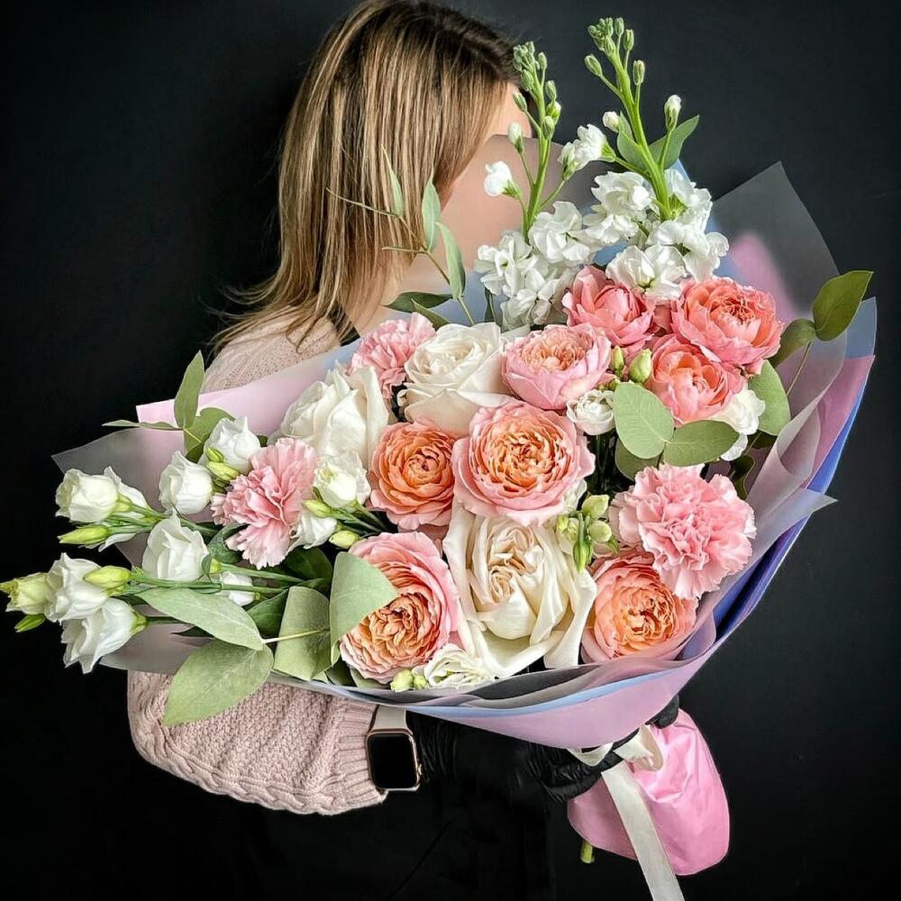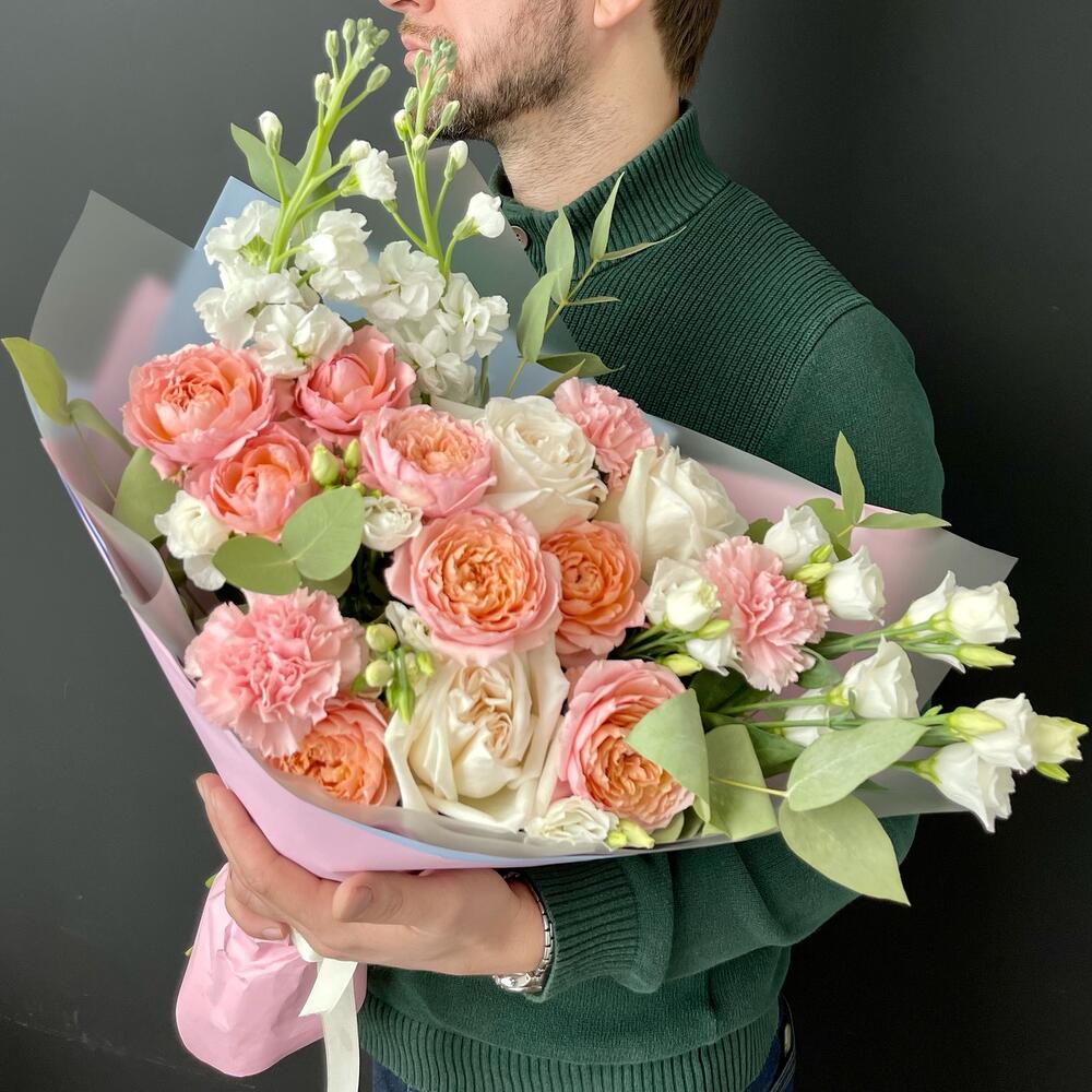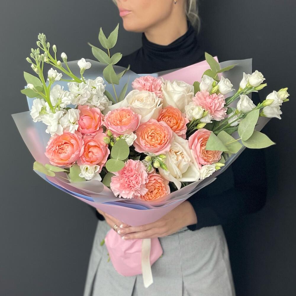 Букет из пионовидных персиковых роз и эвкалипта