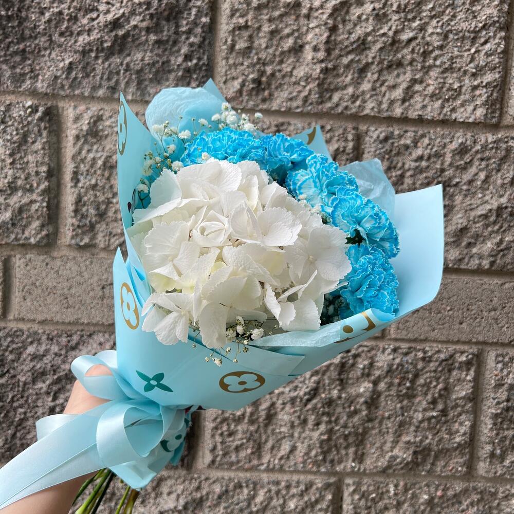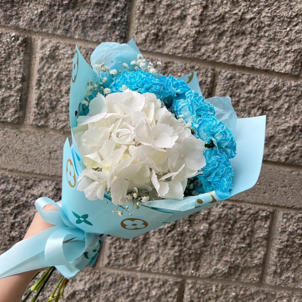 Гортензия – 1 шт.Диантус – 5 шт.Гипсофила – 2 шт.Упаковка дизайнерская – 4 шт.Лента атласная – 2 шт.