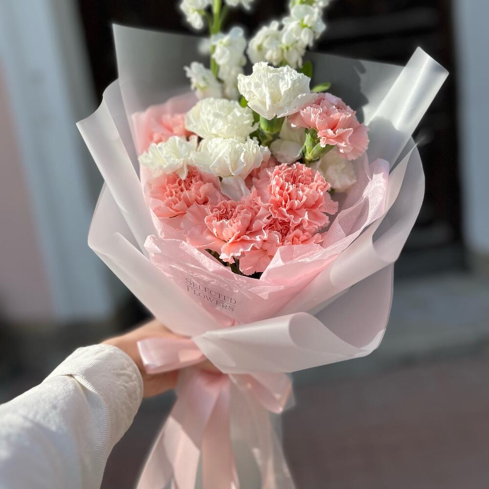 Гвоздика – 13 шт.Маттиола белая – 2 шт.Дизайнерская упаковка – 1 шт.