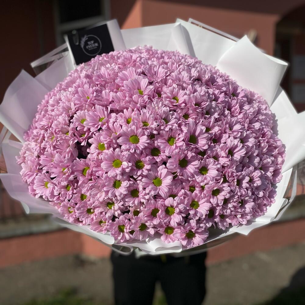 Букет из 41 ветки ромашковых хризантем в дизайнерском оформлении. Количество ромашек в букете может достигать 401 штуки