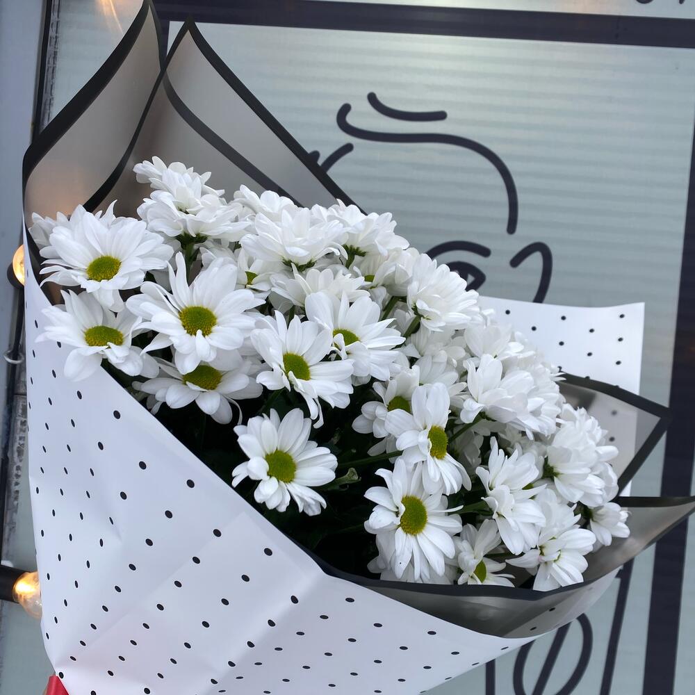 Хризантема кустовая – 9 шт.Упаковка дизайнерская – 2 шт.Лента – 1 шт.
