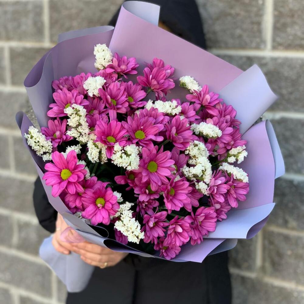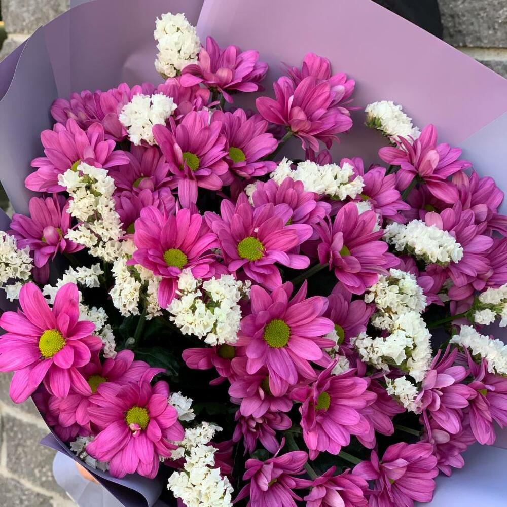 Хризантема кустовая – 7 шт.Статица – 2 шт.Упаковка дизайнерская – 1 шт.Лента атласная – 1 шт.