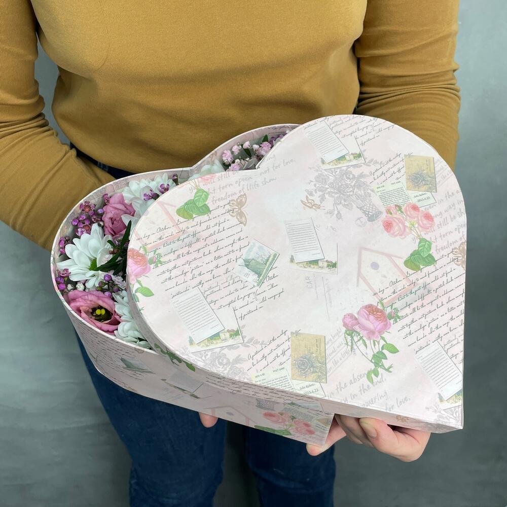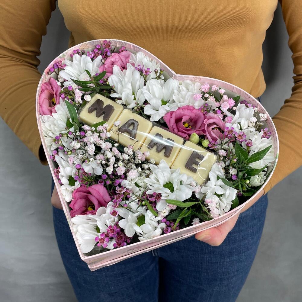 Коробка сердце – 1 шт.Оазис – 1 шт.Буква шоколадная – 4 шт.Хризантема кустовая – 2 шт.Лизиантус – 2 шт.Ваксфлауэр – 1 шт.Гипсофила – 1 шт.Фисташка – 1 шт.