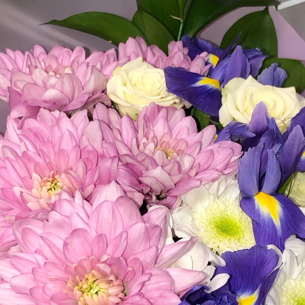 Ирис – 4 шт.микс хризантем – 3 шт.Лизиантус – 2 шт.листики – 3 шт.Упаковка – 1 шт.