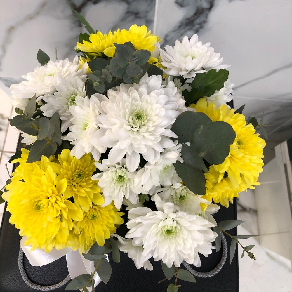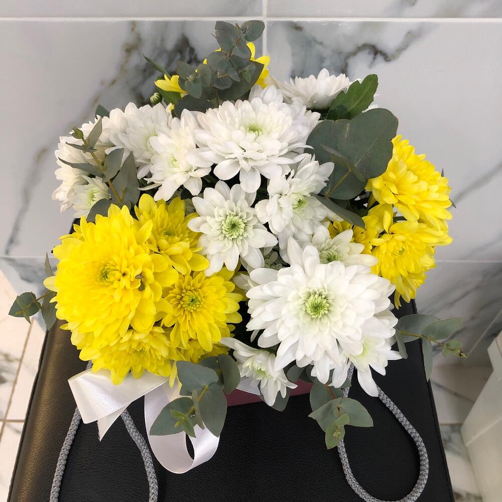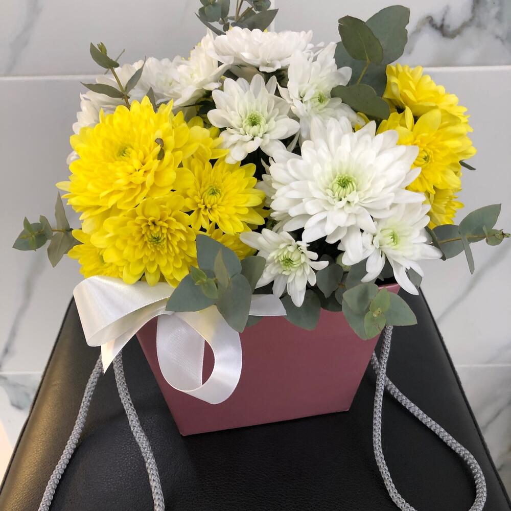 Хризантема кустовая – 7 шт.Эвкалипт Микс – 1 шт.Оазис флористический – 1 шт.Сумочка – 1 шт.
