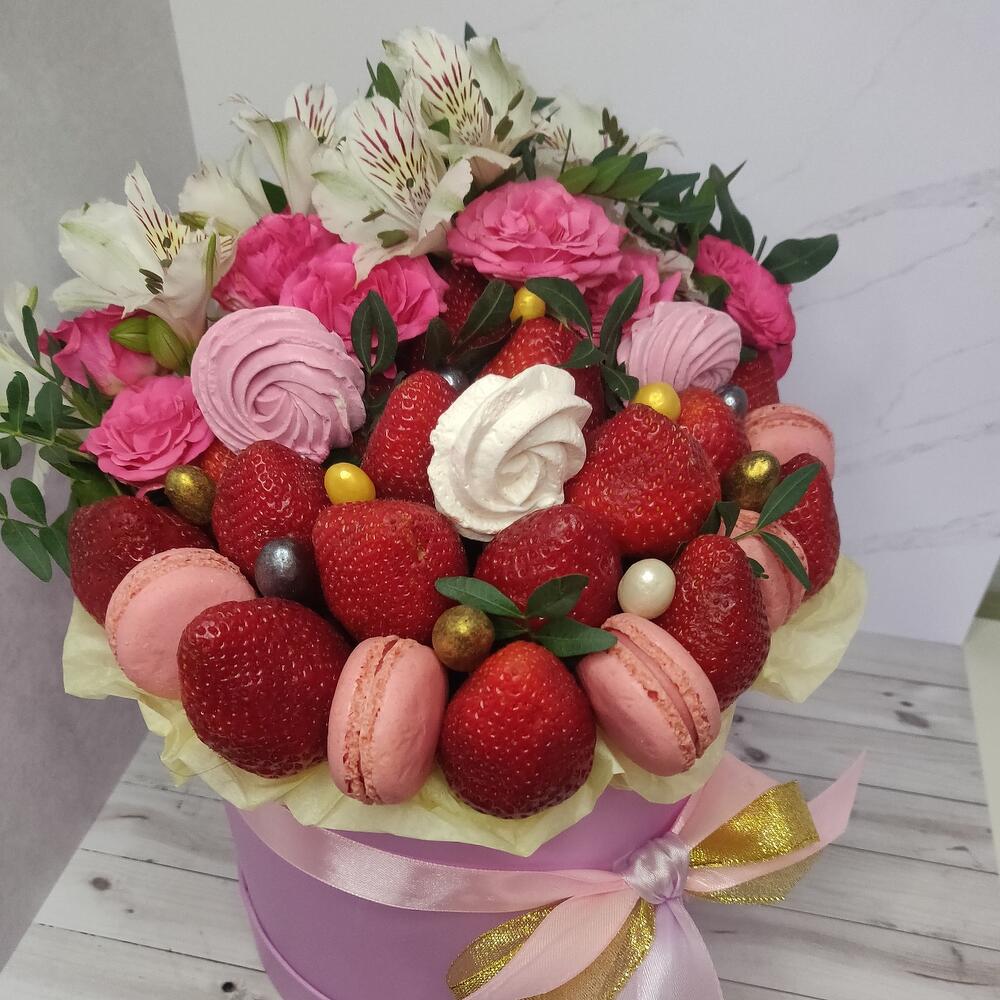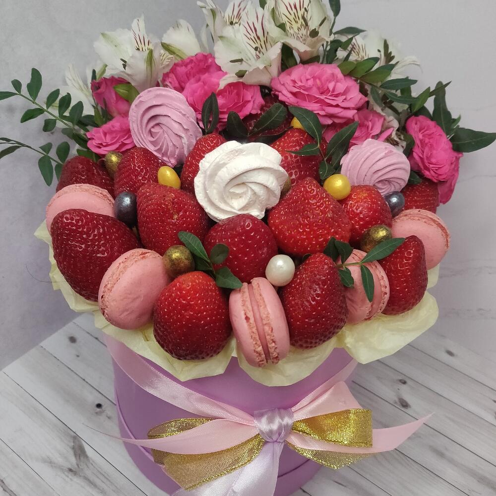 Альстромерия – 2 шт.Клубника – 500 гр.Кустовая роза – 3 шт.Шляпная коробка – 1 шт.маккаруны – 5 шт.Меренга (безе) ручной работы – 3 шт.
