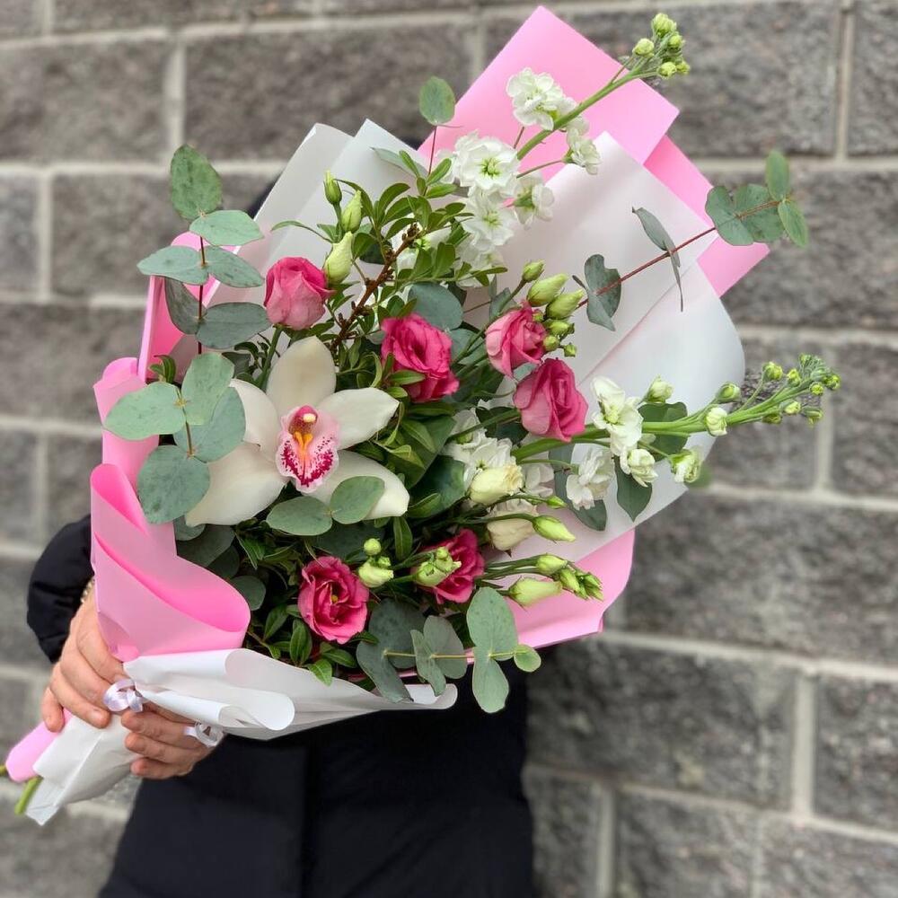 Маттиола – 2 шт.Эустома – 2 шт.Орхидея Цимбидиум – 1 шт.Эвкалипт – 2 шт.Зелень – 5 шт.Упаковка дизайнерская – 1 шт.Лента атласная – 1 шт.