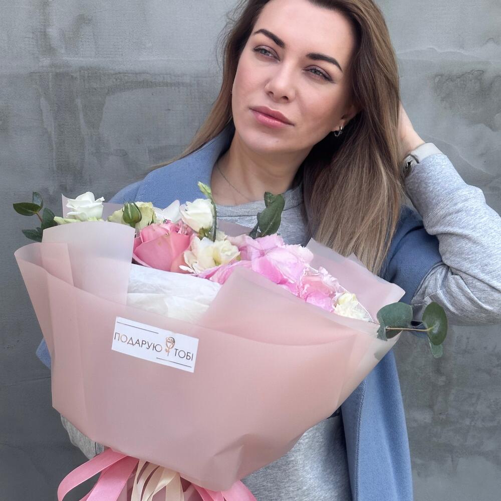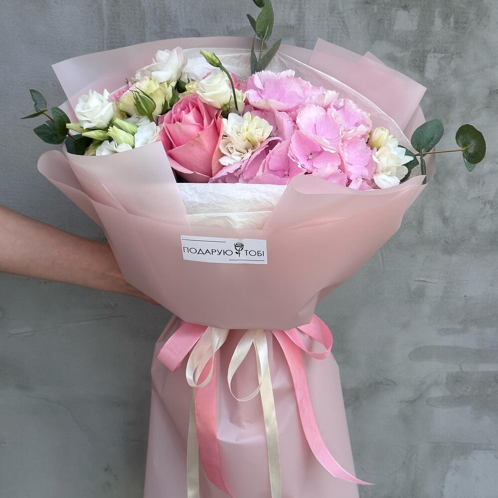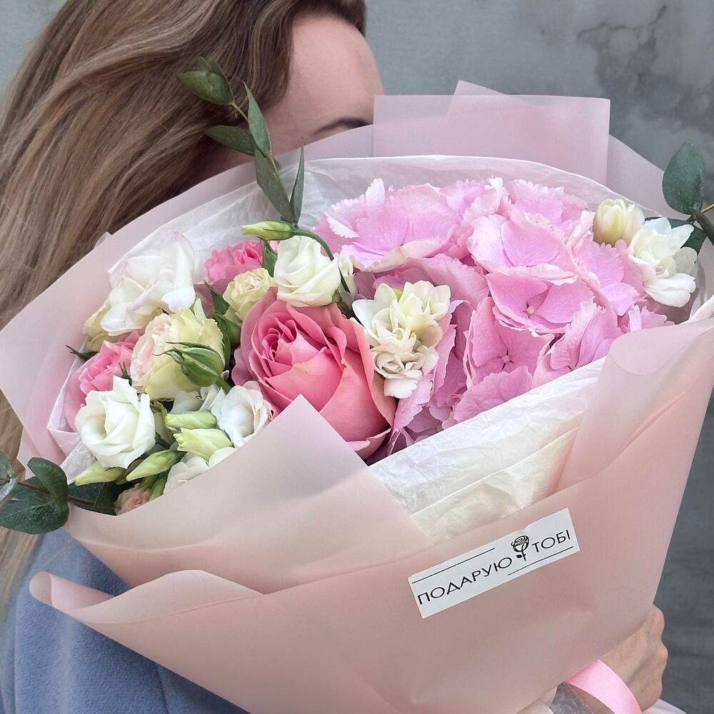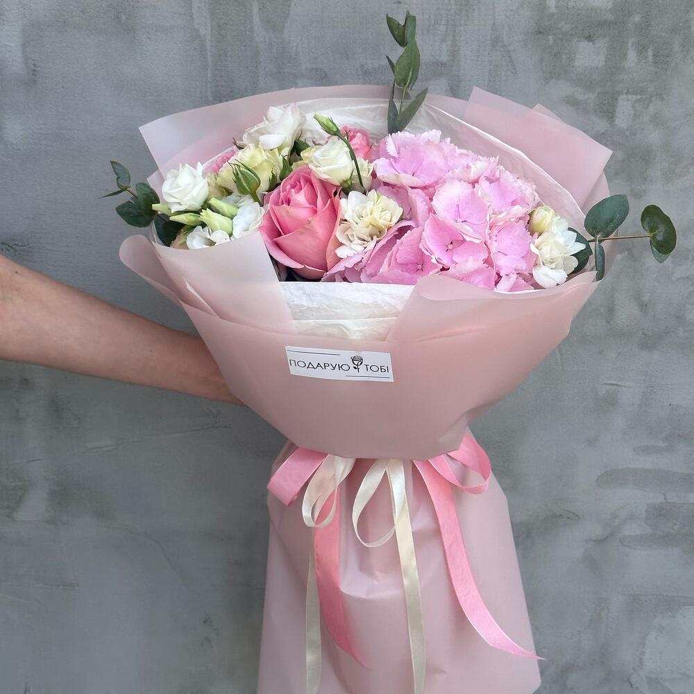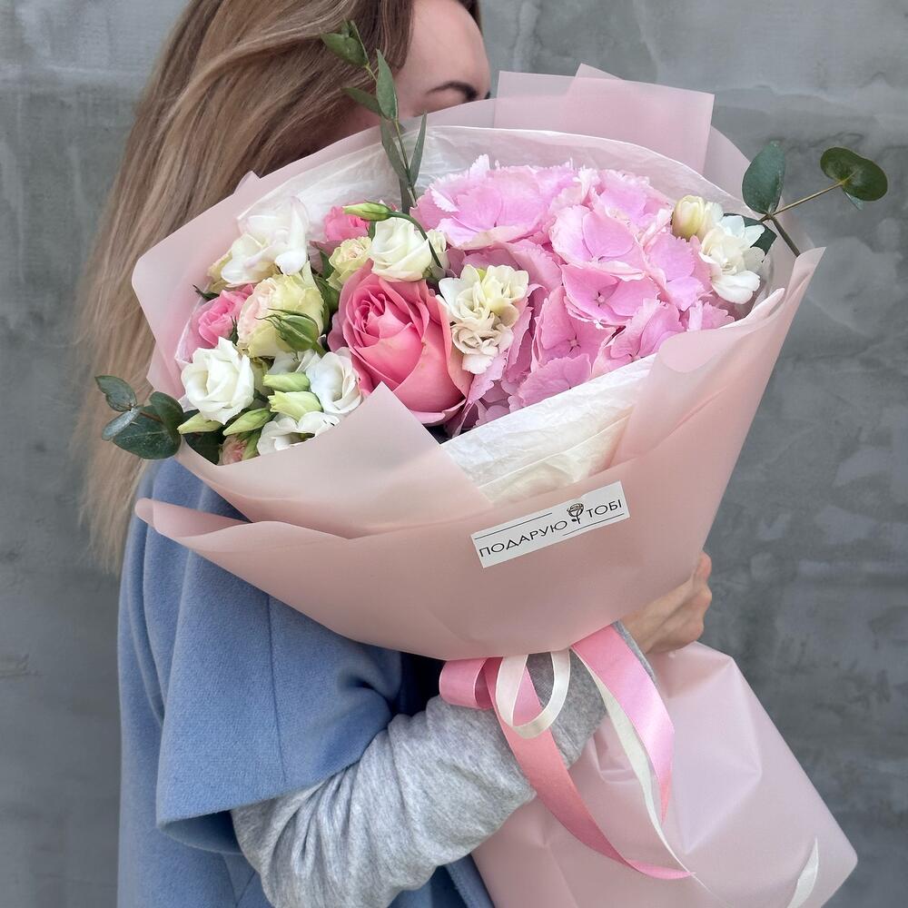 Ніжний букет в рожевих кольорах з гортензією неодмінно подарую усмішку вашій дорогій людині.