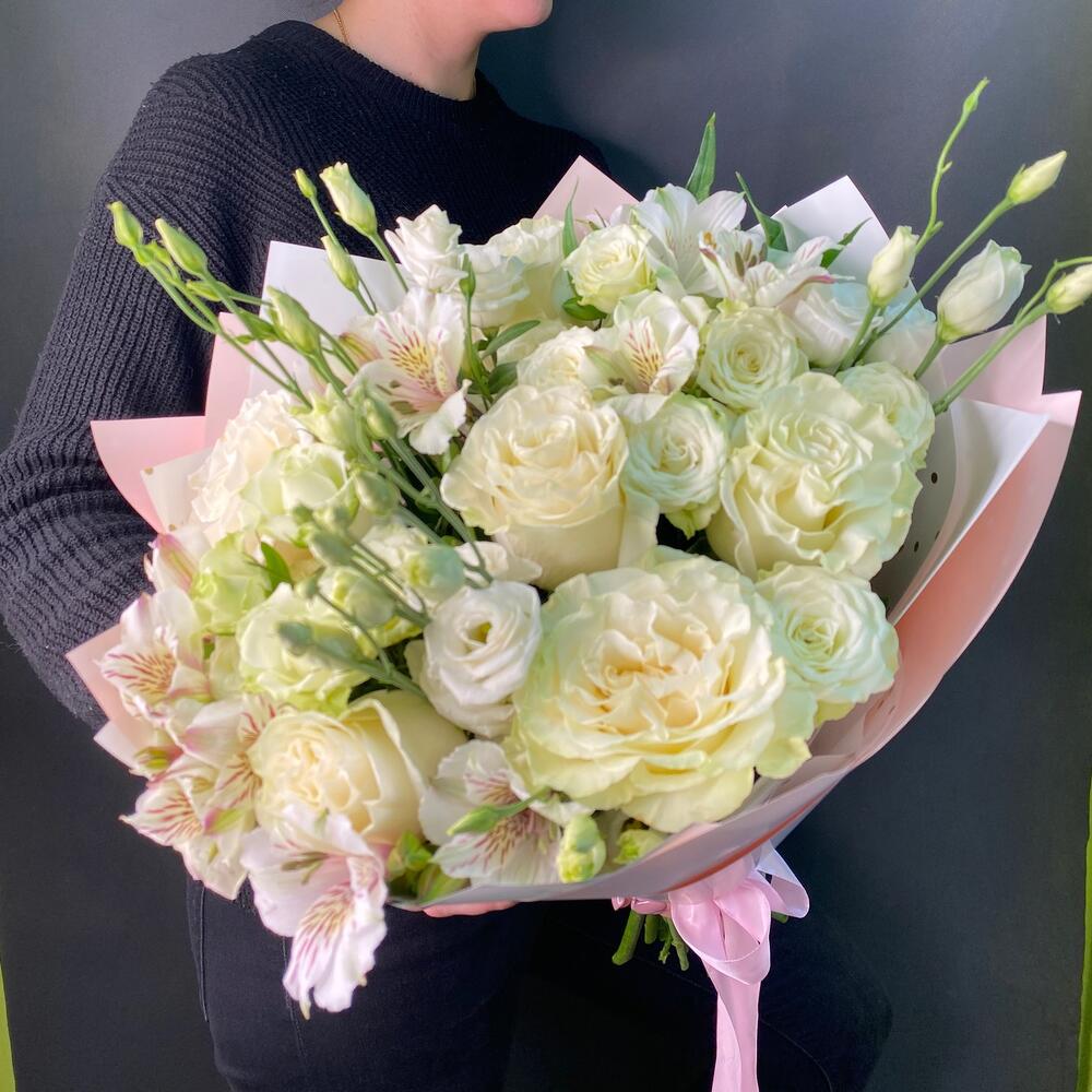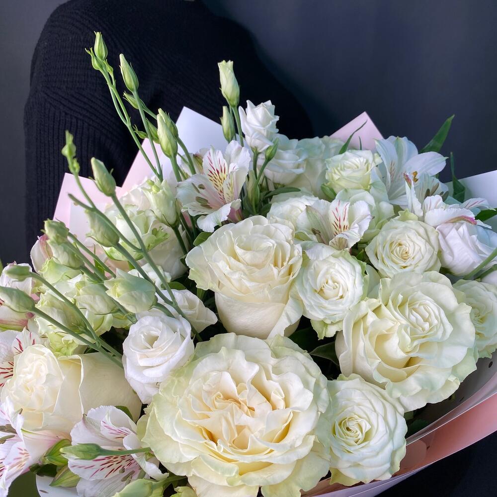 Роза Эквадор – 7 шт.Альстромерия – 5 шт.Лизиантус – 3 шт.Упаковка дизайнерская – 1 шт.