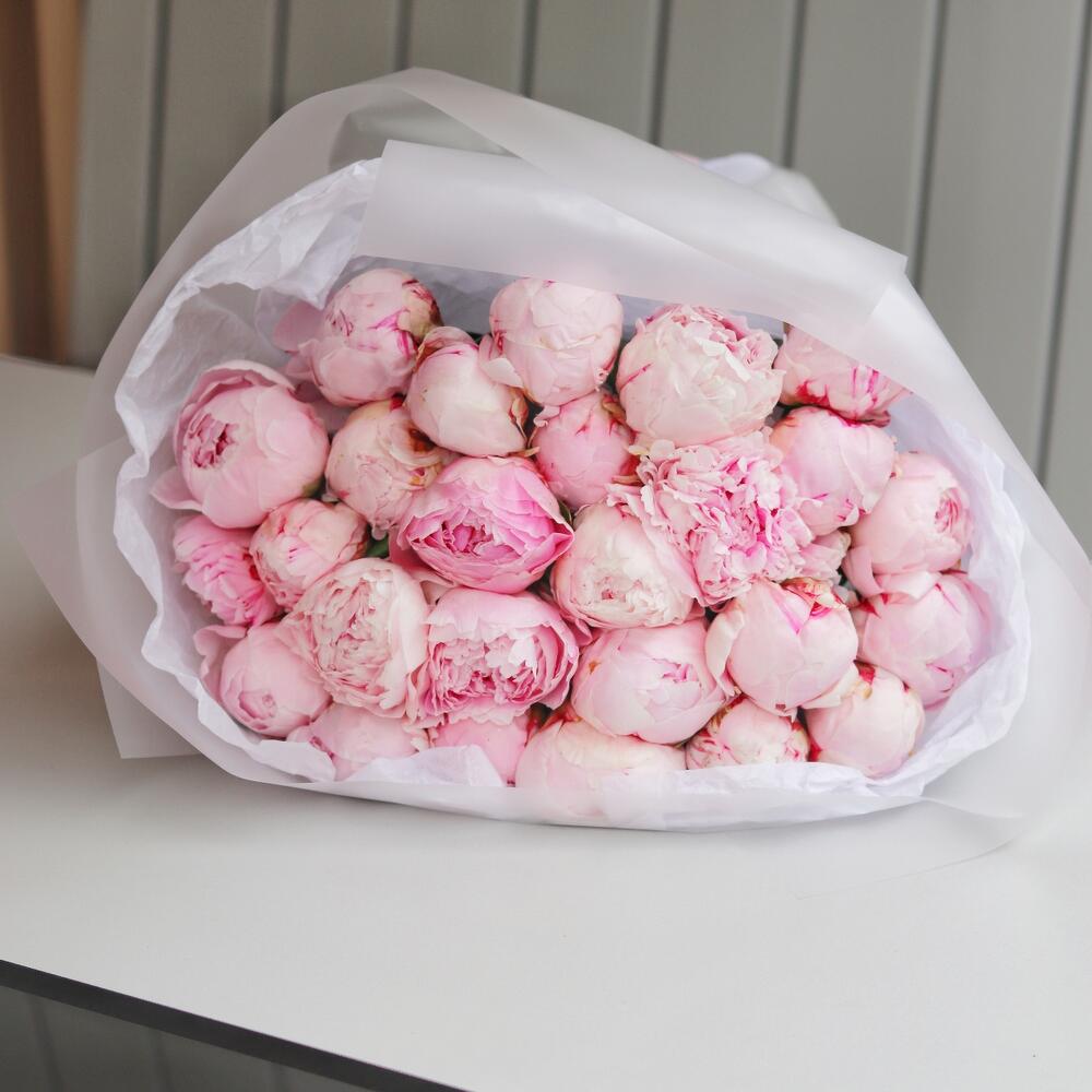 Розовый пион – 25 шт.Дизайнерская упаковка – 1 шт.Транспортировочная коробка – 1 шт.инструкция по уходу за цветами – 1 шт.подкормка для срезанных цветов – 1 шт.Открыточка с вашими пожеланиями – 1 шт.Шоколадка – 1 шт.