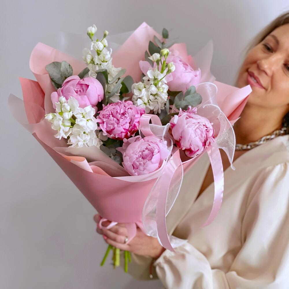 Розовые зефирные пионы и ароматная белая маттиола в нежном букете для самой любимой девушки.К каждому букету мы прикладываем:- открытку с Вашими пожеланиями- инструкцию по уходу за букетом- пакетик кризала для продления жизни цветам