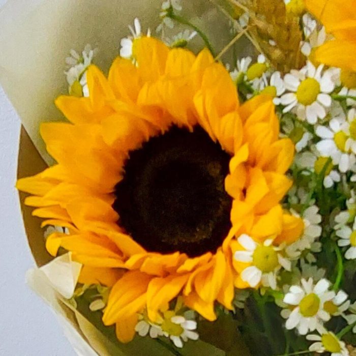 Букет с подсолнухами и ромашками в крафте
