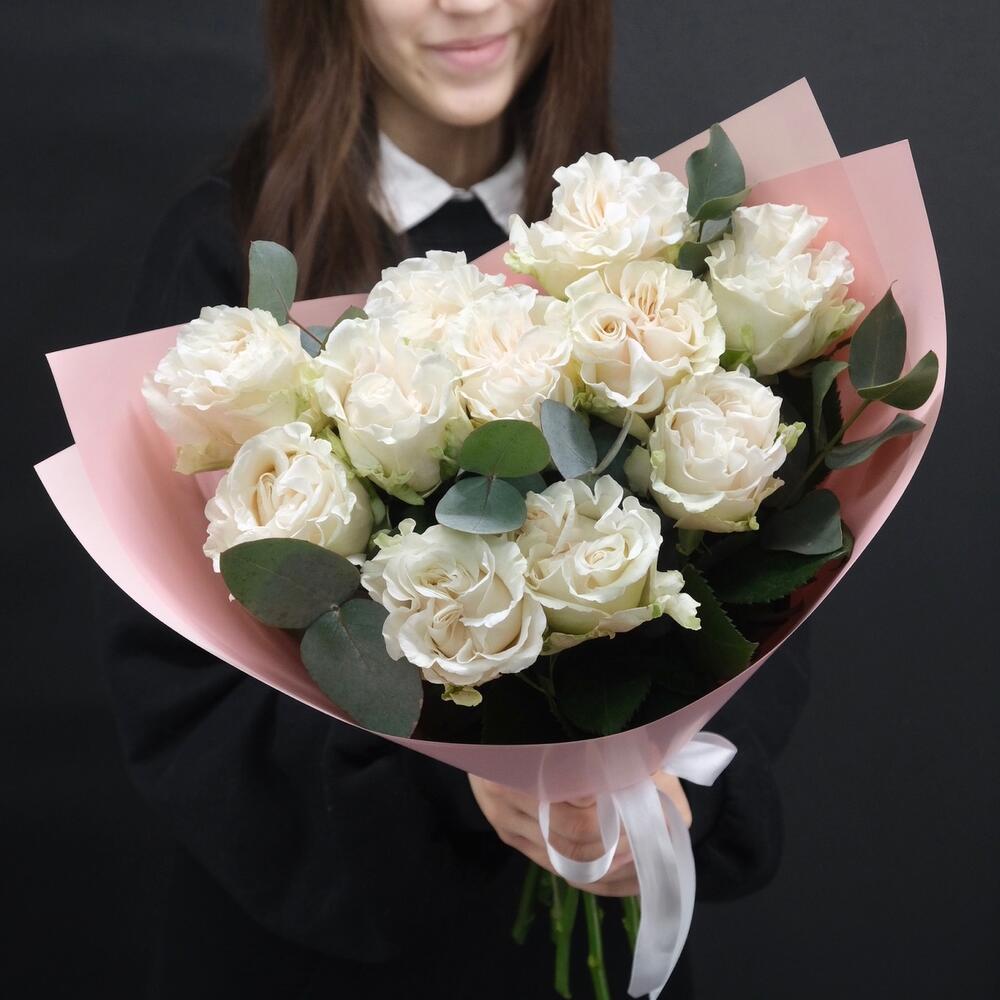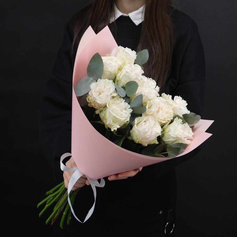 11 белых пионовидных роз с эвкалиптом