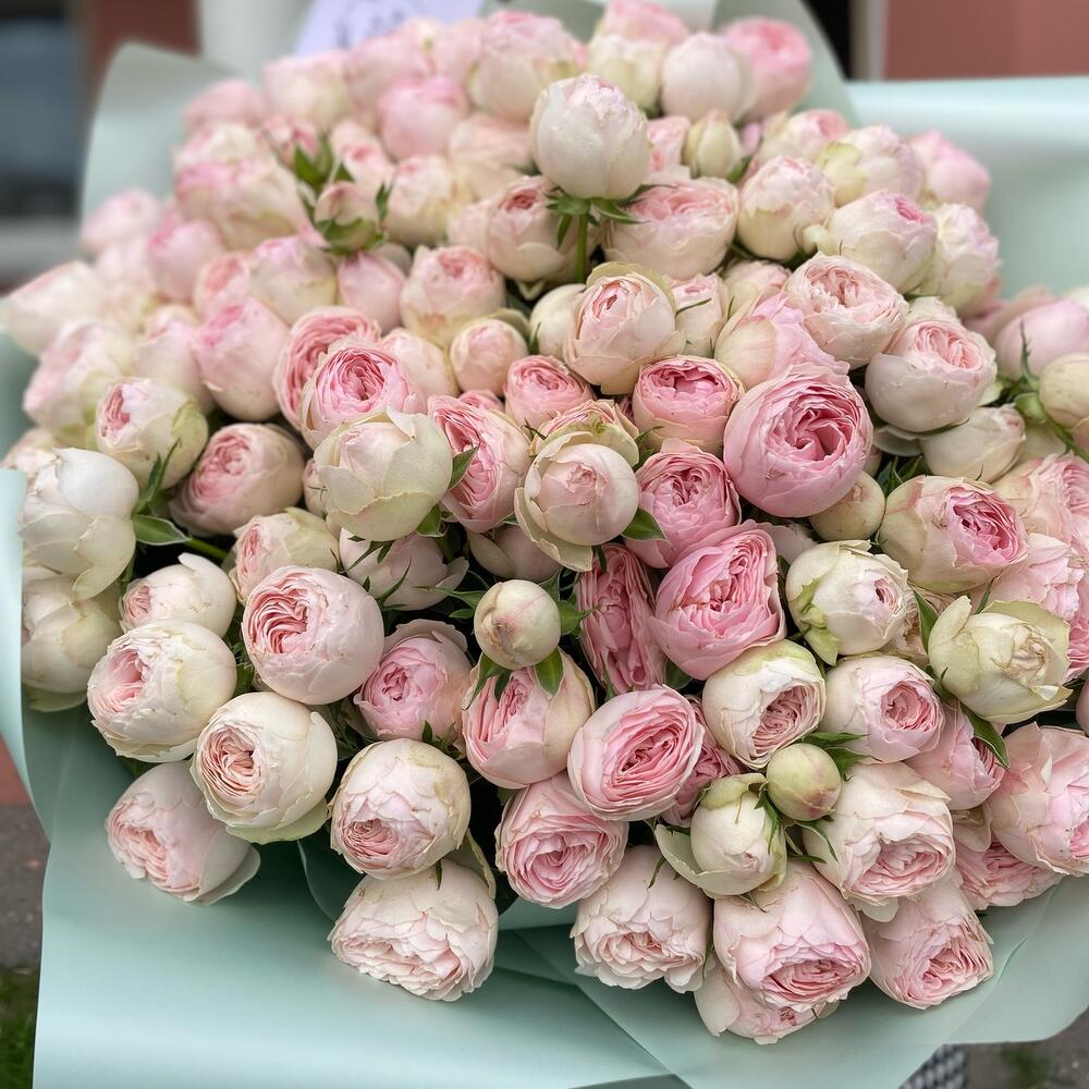 Букет из 35 кустовых пионовидных веток сорта Mansfield park в дизайнерском оформлении. Количество розочек(бутонов) может достигать 171 штучки