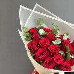 Эвкалипт – 7 шт.Атласная лента – 1 шт.Роза Эквадор 60 см – 21 шт.Дизайнерская упаковка – 1 шт.