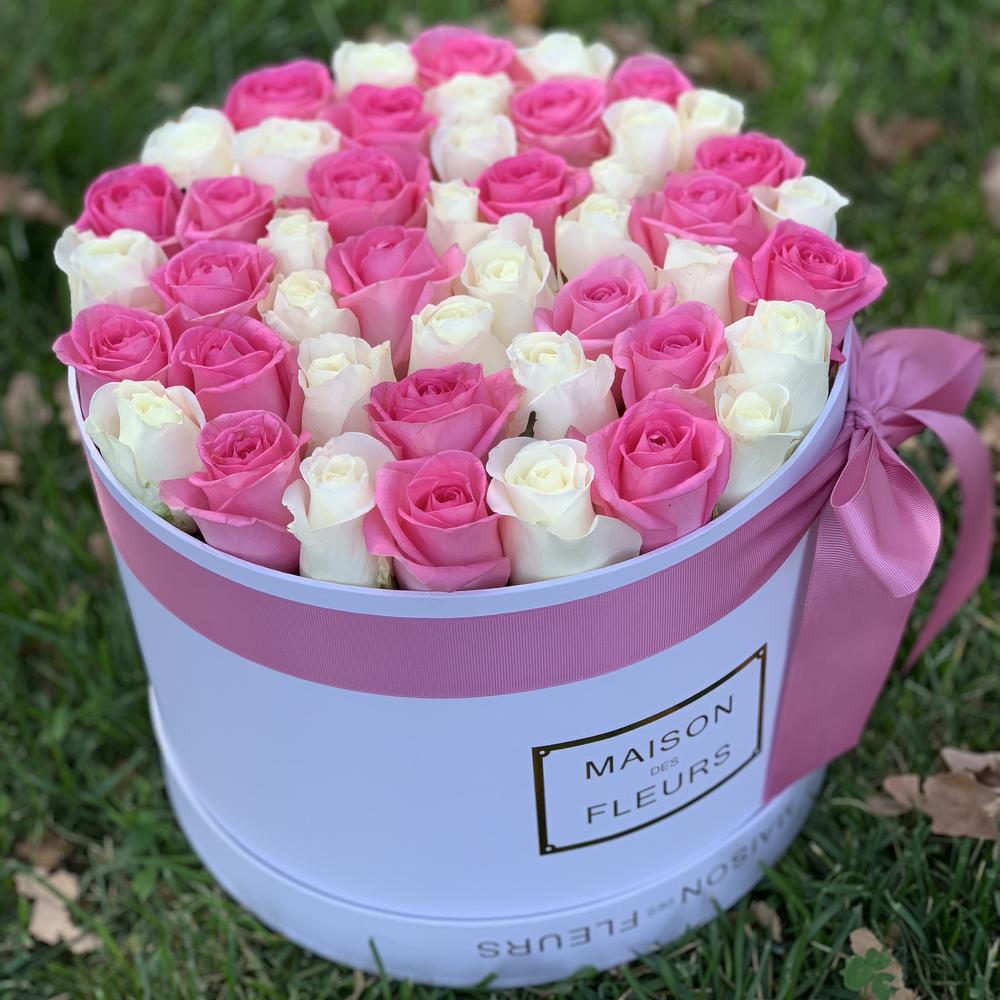 45 роз розовых и белых в коробке