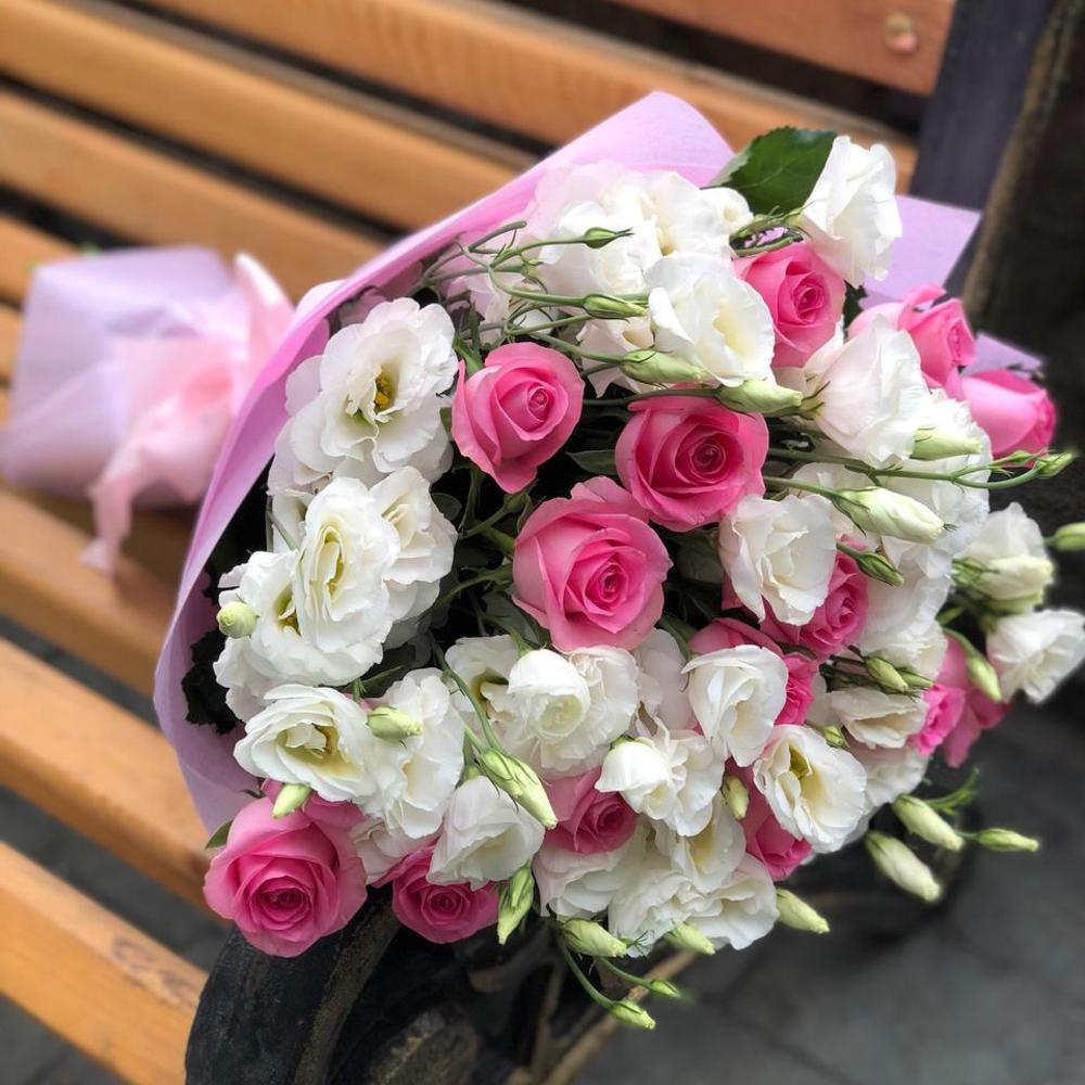 Белые эустомы с розовыми розами