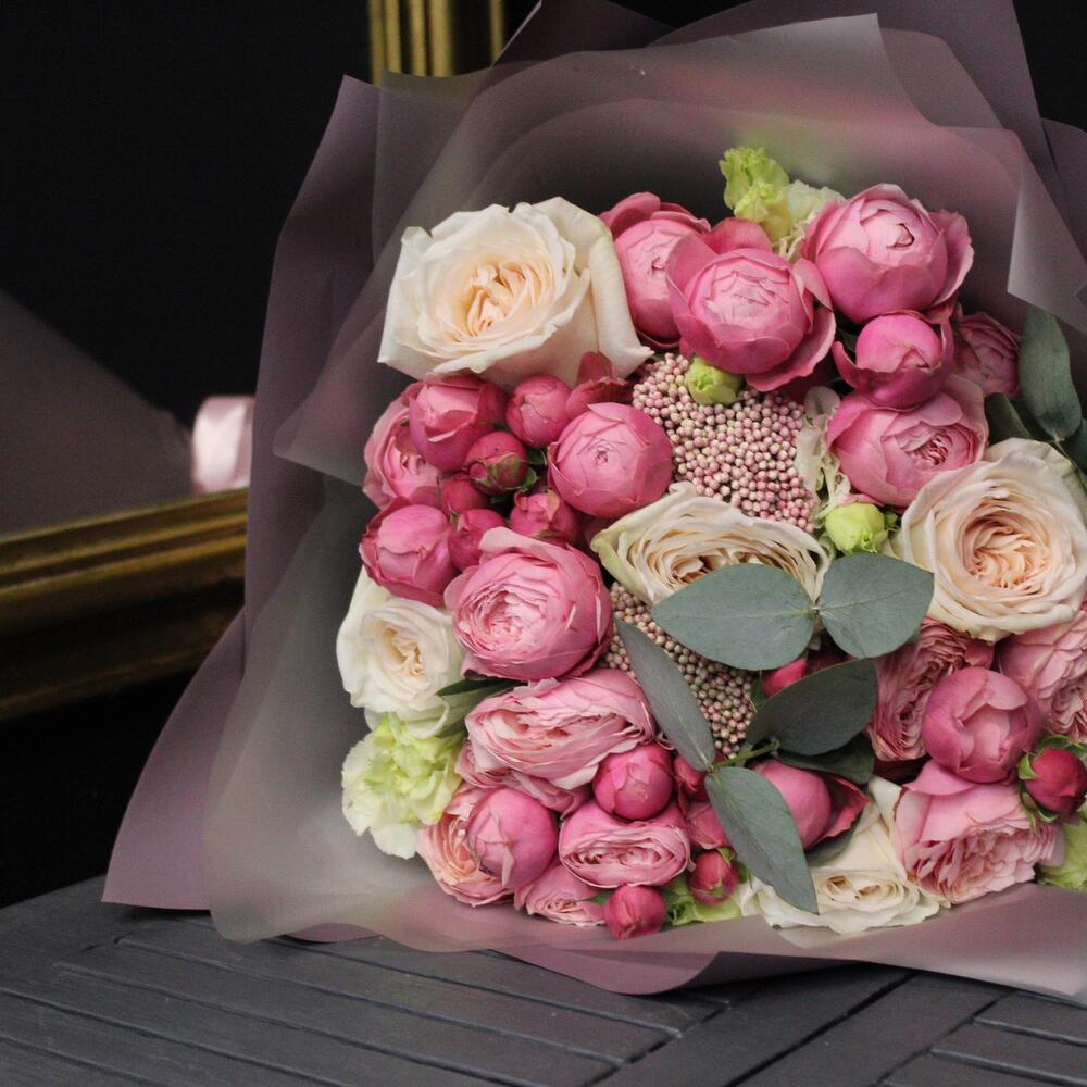 Озотамнус – 2 шт.Лента атласная – 2 шт.Пленка матовая – 5 шт.эустома махровая – 1 шт.Эвкалипт Baby Blue – 2 шт.роза вайт о хара( ароматная) – 5 шт.сильва пинк кустовая роза пионовидная – 5 шт.