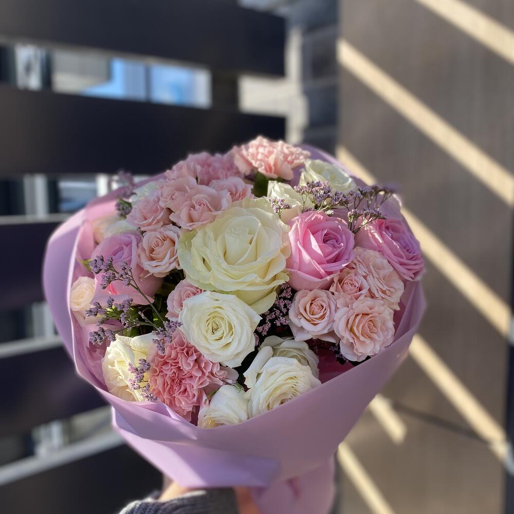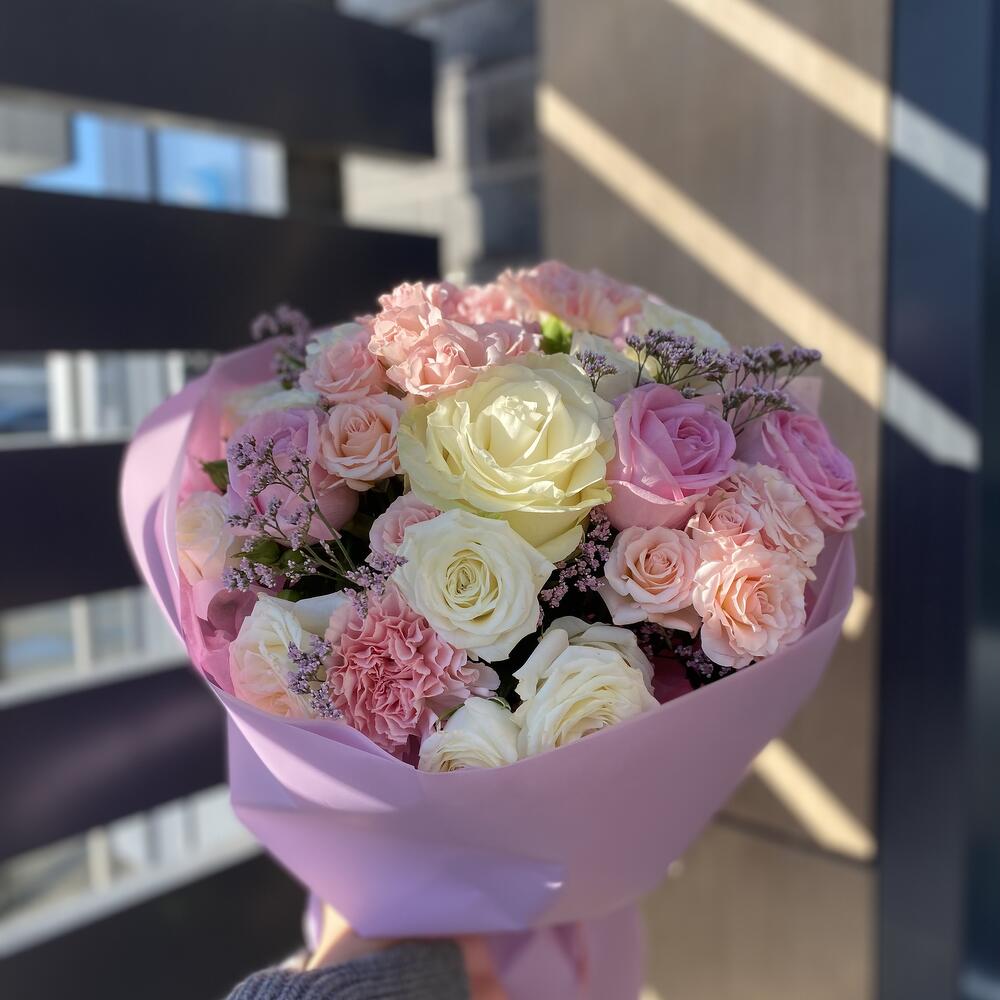 Альстромерии, Гвоздики, Кустовые розы, Лизиантусы, Розы, Хризантемы