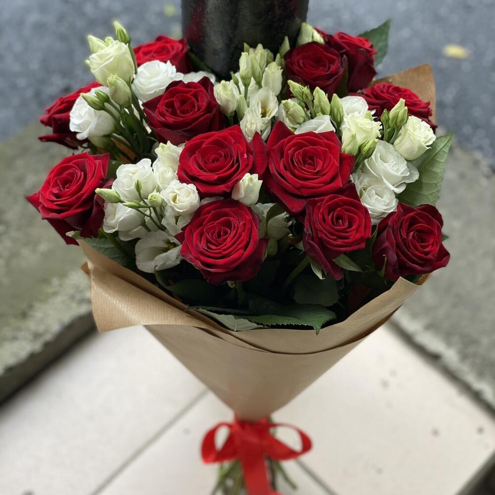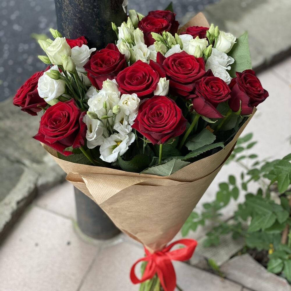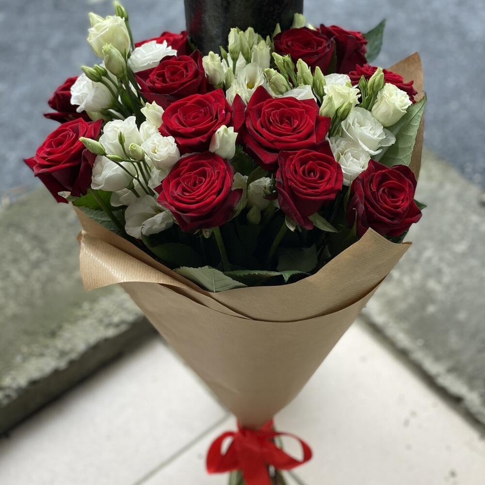 Роза красная – 13 шт. эустома белая – 6 шт. Упаковка крафт бумага – 1 шт.