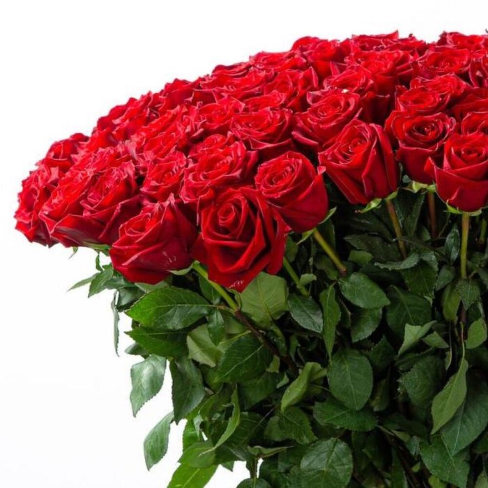 Роза голландская красная – 101 шт.Лента атласная – 2 шт.Открыточка с вашими пожеланиями – 1 шт.хорошее настроение – 100 шт.инструкция по уходу за цветами – 1 шт.коробка переноска – 1 шт.Кризал – 1 шт.