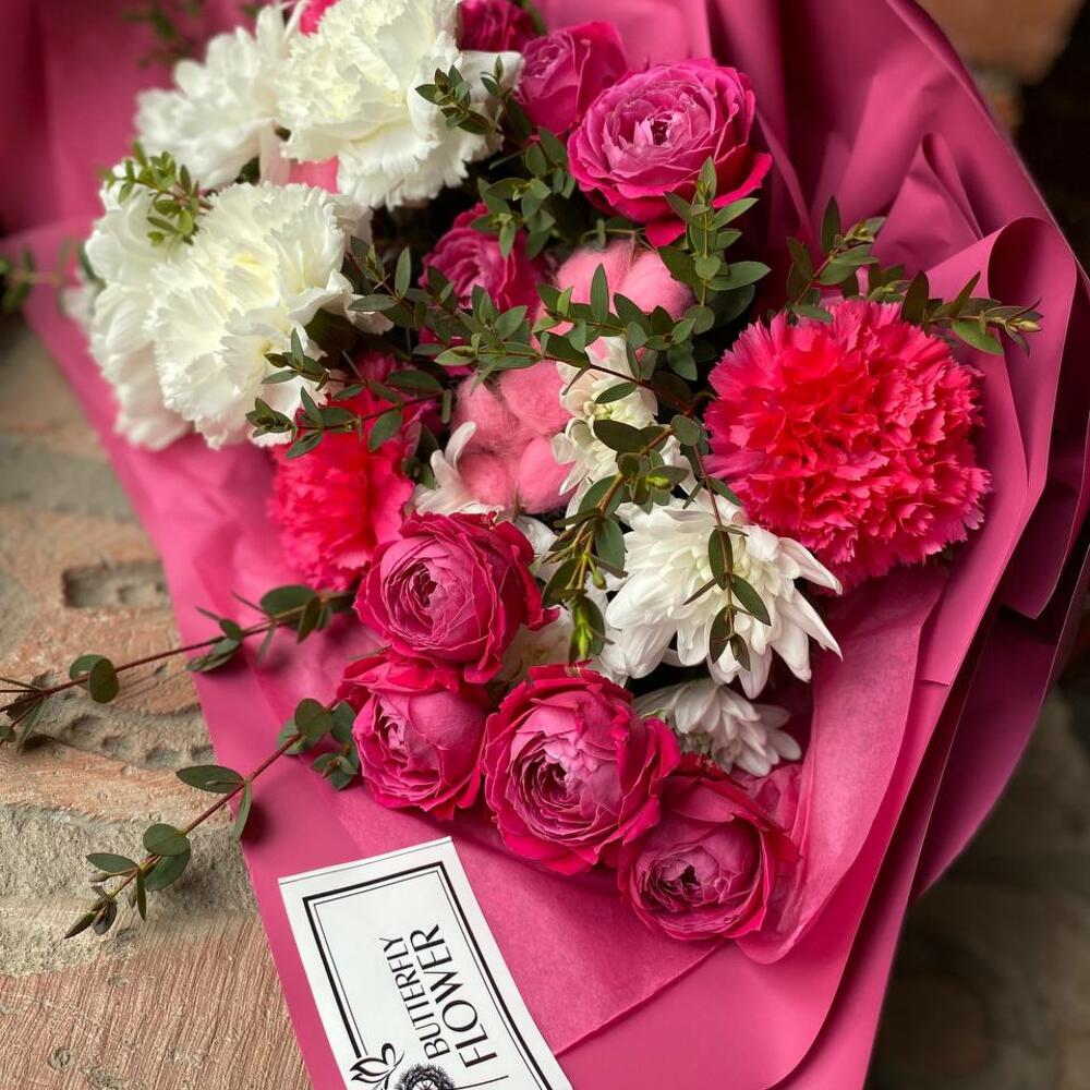 Категорий: Гвоздики, Кустовые розы, Пионовидные розы, Розы, Хризантемы