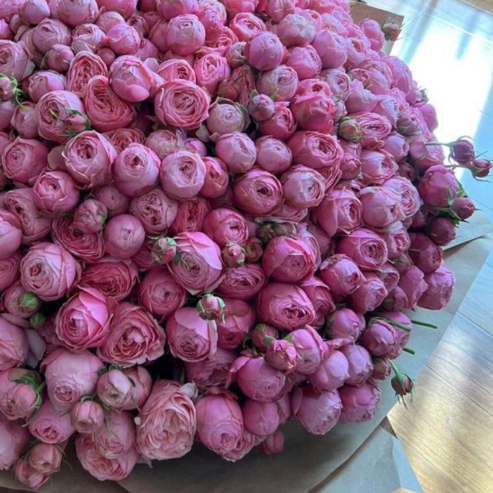 роза розовая пионовидная кустовая – 201 шт.Упаковка дизайнерская – 2 шт.Лента атласная – 2 шт.Открыточка с вашими пожеланиями – 1 шт.хорошее настроение – 100 шт.инструкция по уходу за цветами – 1 шт.коробка переноска – 1 шт.Кризал – 1 шт.