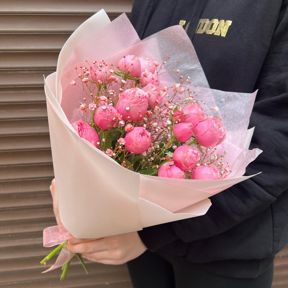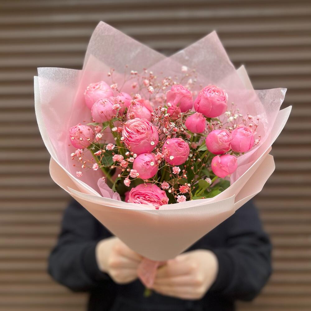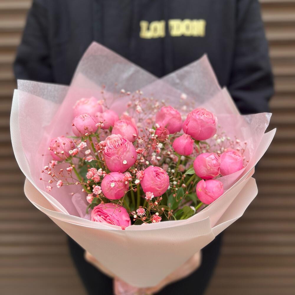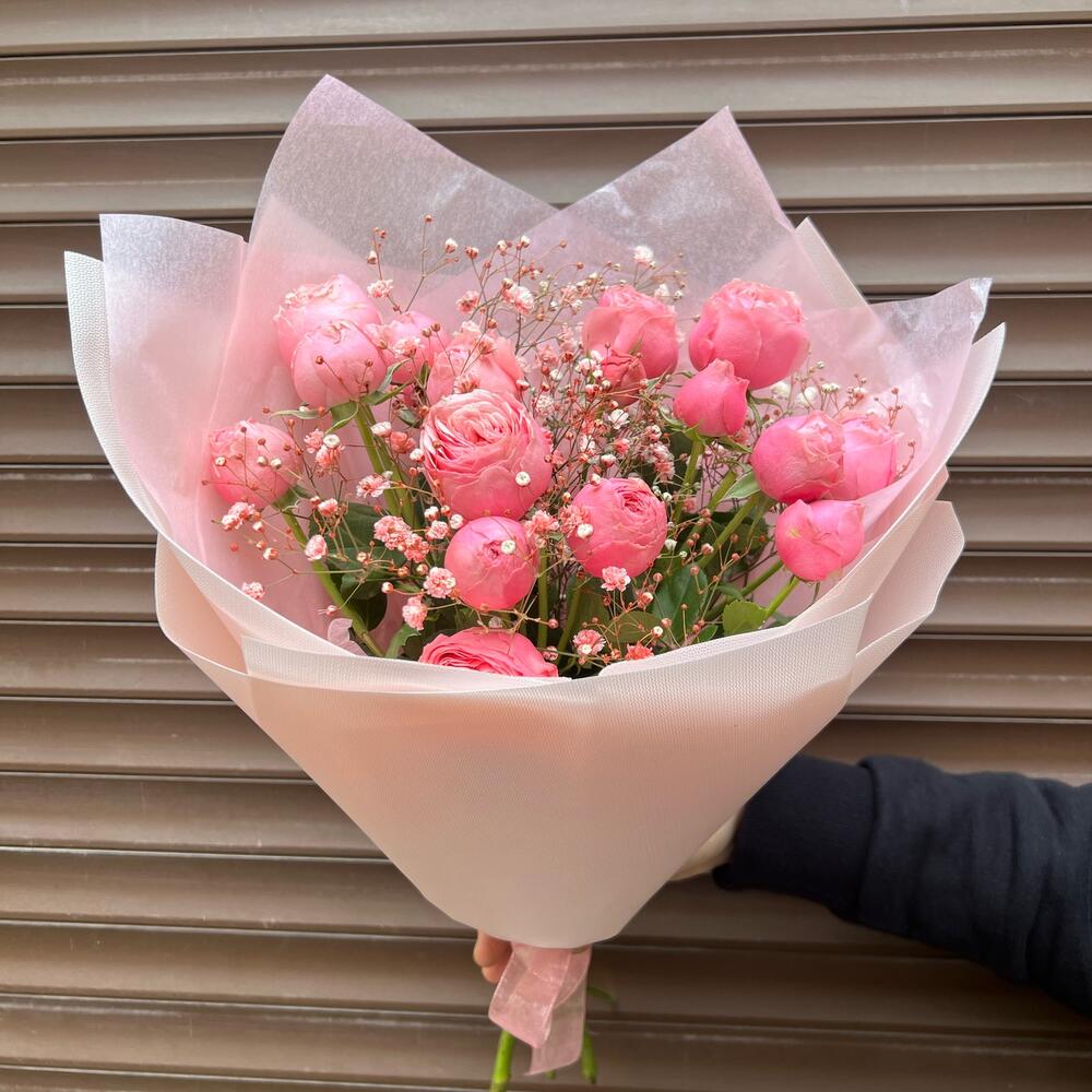 сильва пинк кустовая роза – 3 шт.Гипсофила – 2 шт.Пленка матовая – 1 шт.