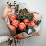 Пионовидная роза одноголовая – 9 шт.Эвкалипт – 3 шт.Рускус – 5 шт.Упаковка дизайнерская – 3 шт.
