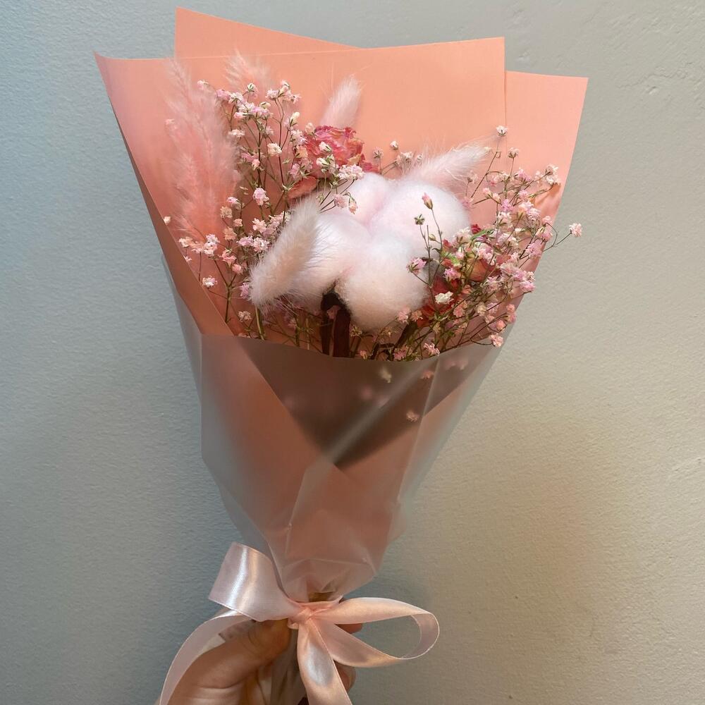 Хлопок – 1 шт.Роза кустовая – 1 шт.Лагурус – 3 шт.Гипсофила – 1 шт.Помпасная трава – 2 шт.Авторская упаковка – 1 шт.Открыточка с вашими пожеланиями – 1 шт.