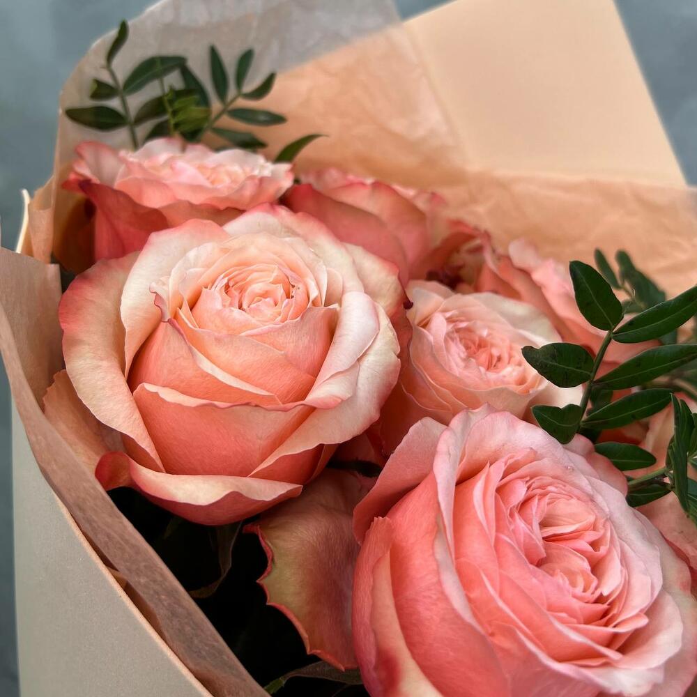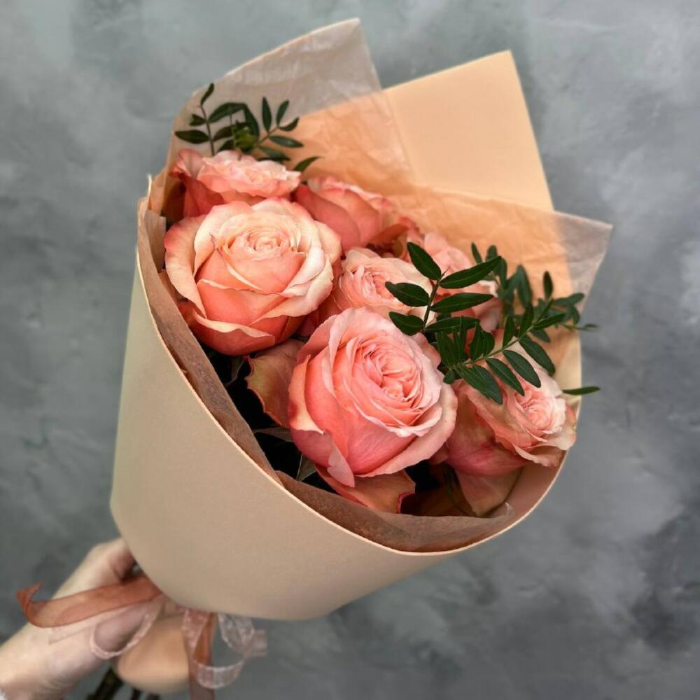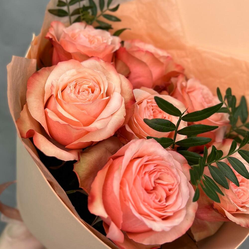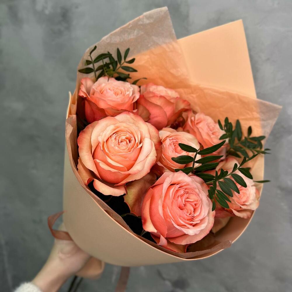 Зелень – 1 шт.Упаковка – 1 шт.Лента атласная – 1 шт.Тишью – 1 шт.Пионовидная роза кахала – 7 шт.
