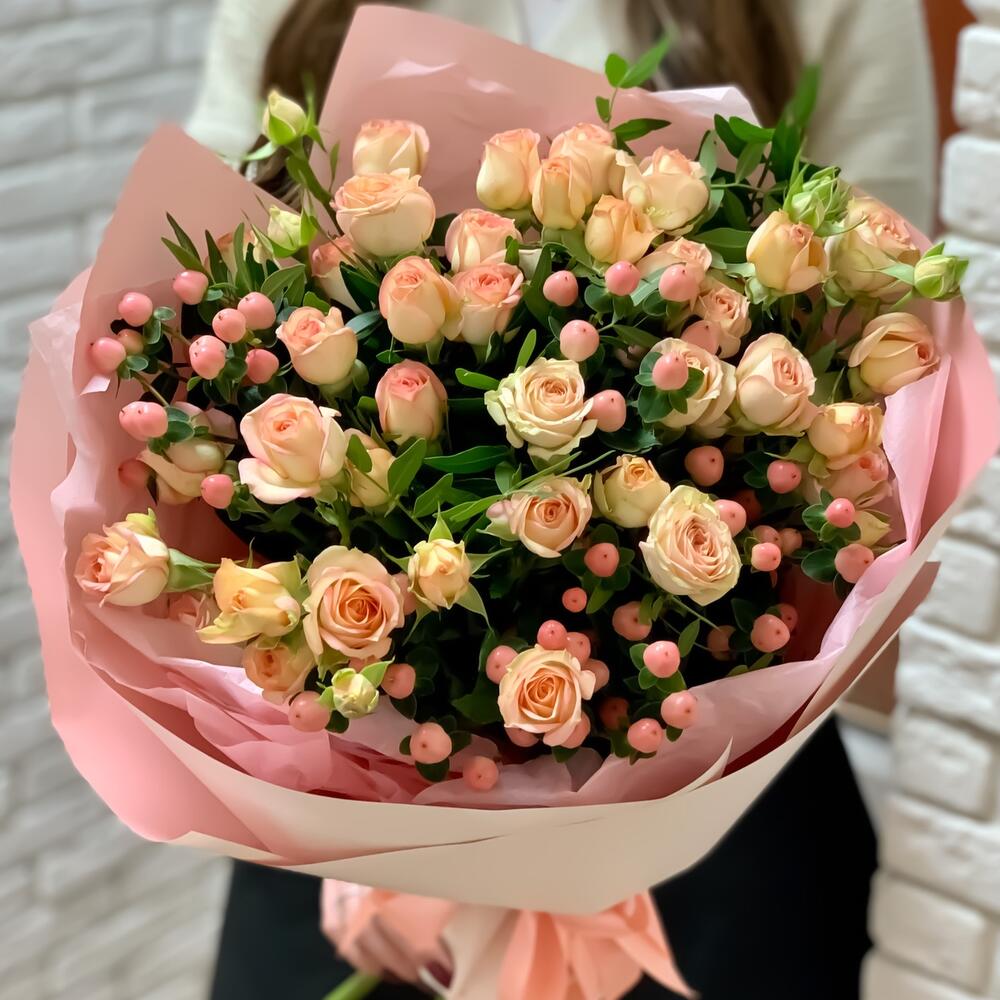 Альстромерии, Кустовые розы, Лизиантусы, Пионовидные розы, Розы, Ромашки