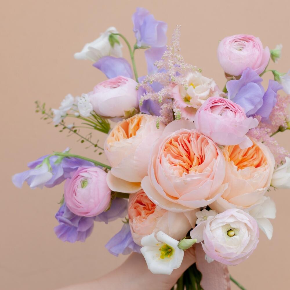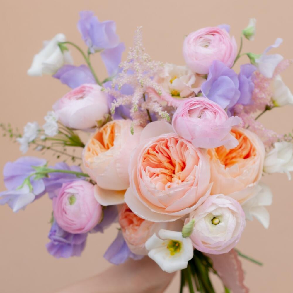 джульетта роза пионовидная – 5 шт.Латирус – 6 шт.Лизиантус – 2 шт.Ранункулюс розовый – 5 шт.Астильба – 2 шт.