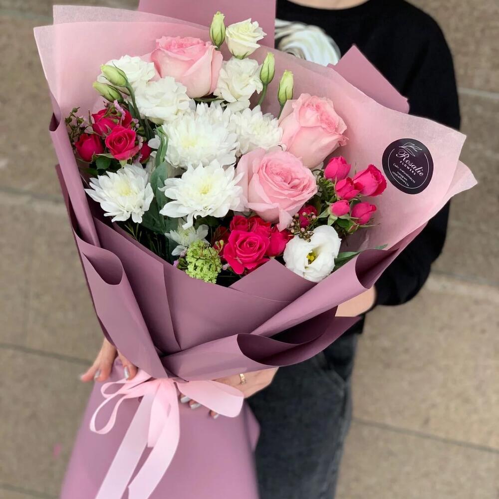 Альстромерии, Гвоздики, Кустовые розы, Лизиантусы, Розы, Хризантемы