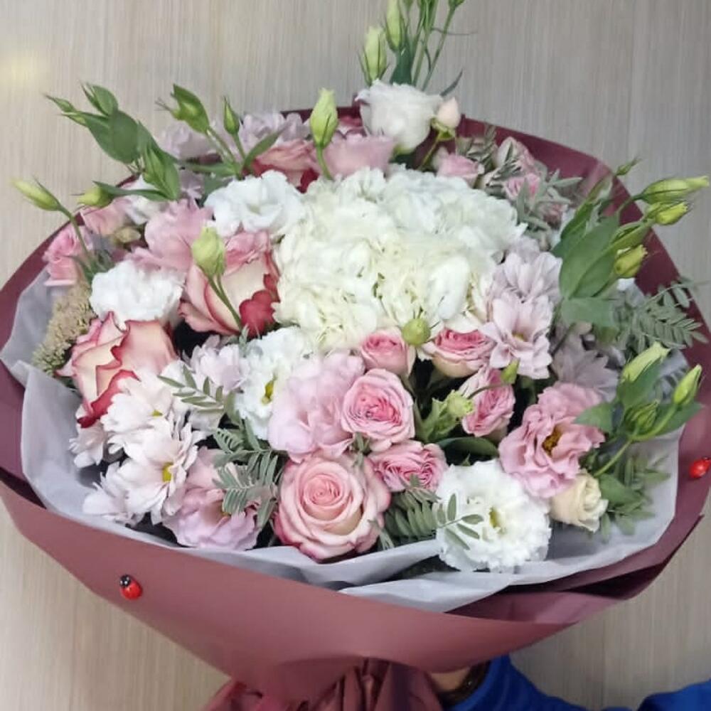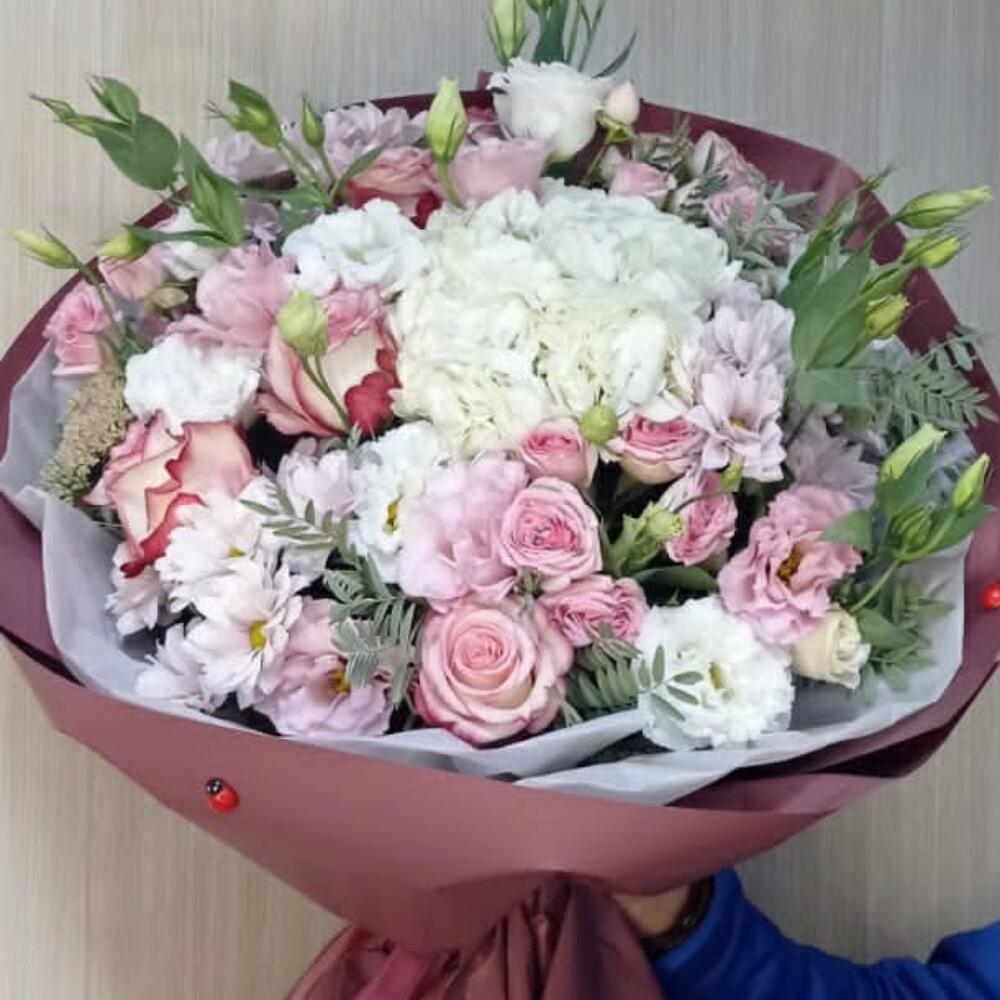 розы эквадор (60 см) – 3 шт. Кустовая роза – 3 шт. Гортензия – 1 шт. Лизиантус Алиса белый – 5 шт.