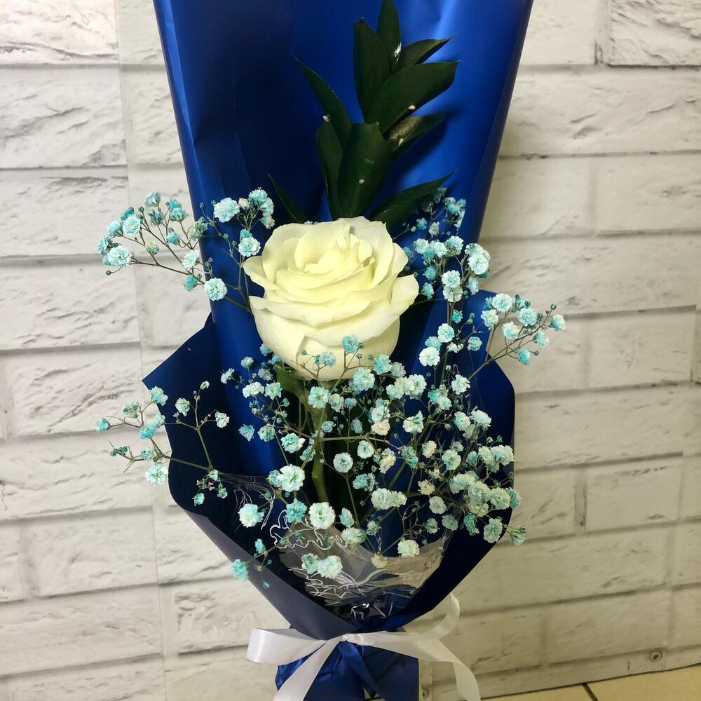 Гипсофила – 1 шт.Рускус – 1 шт.Упаковка – 2 шт.Лента атласная – 1 шт.Роза белая – 1 шт.