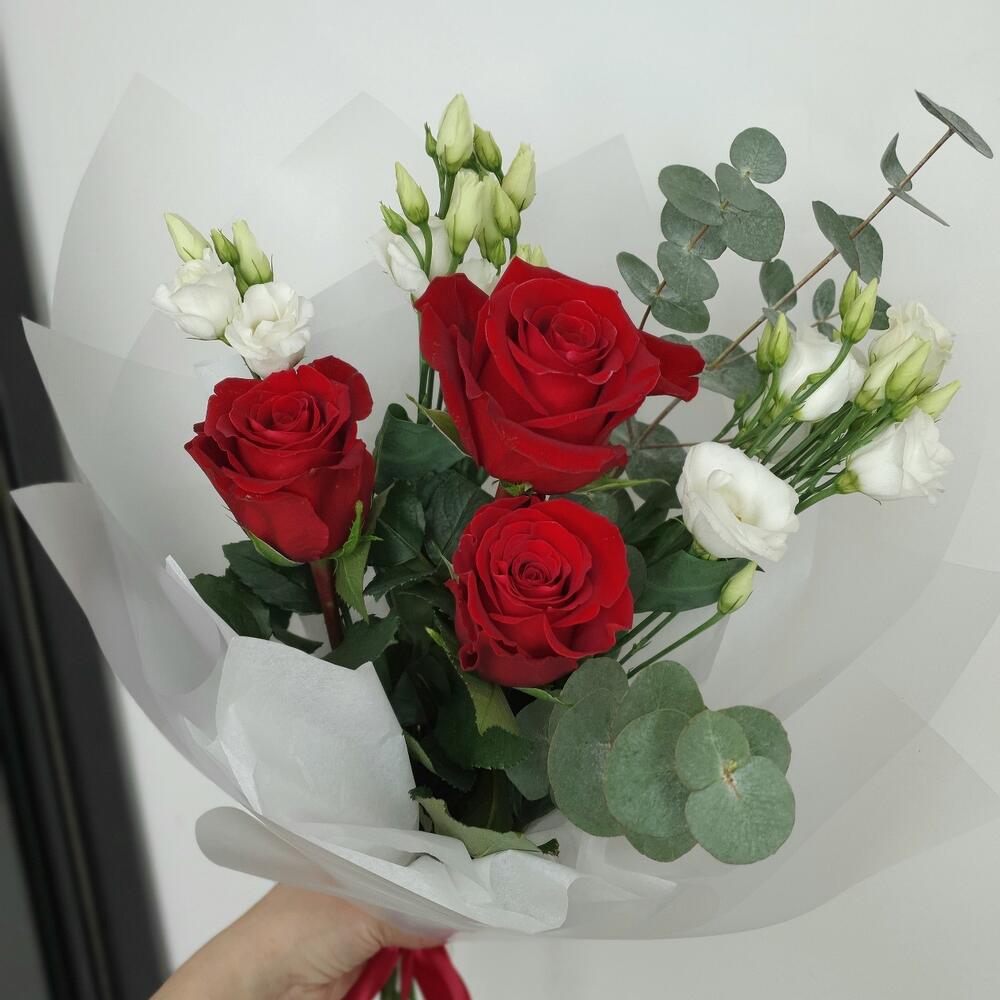 Букет с красными розами , эустомой и эвкалиптом