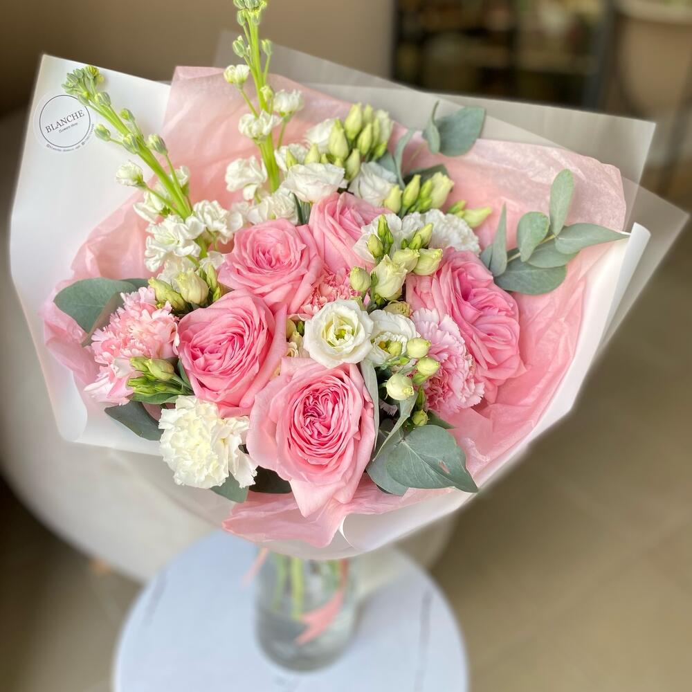 Лизиантус – 5 шт.Маттиола – 2 шт.Эвкалипт – 5 шт.Пионовидная роза – 5 шт.Фирменная упаковка – 1 шт.Диантус сортовой – 5 шт.
