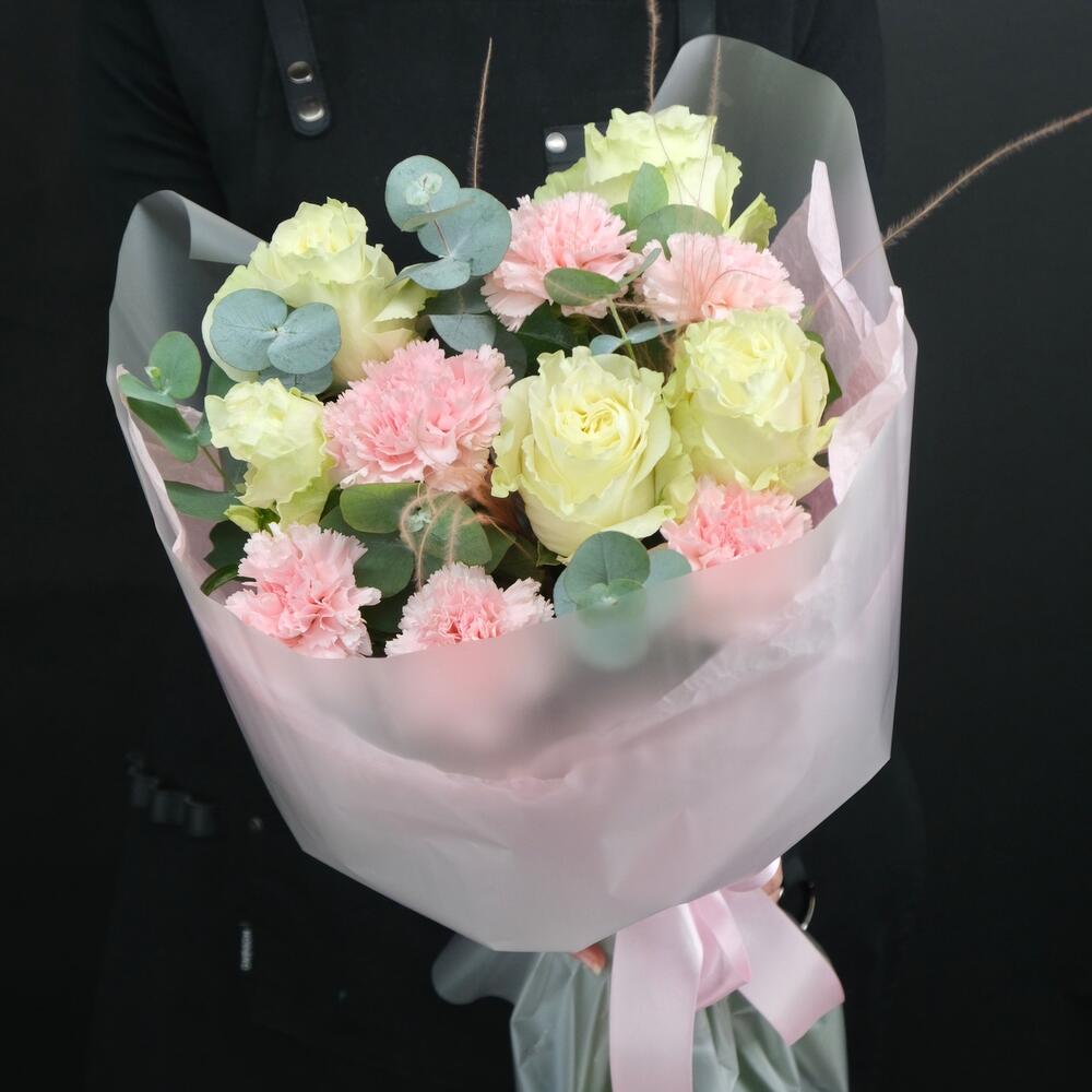 Букет с розами Moonstone и розовыми диантусами