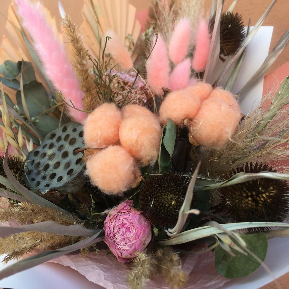 Эвкалипт – 5 шт.Роза сухоцвет – 2 шт.Лотос сухой – 1 шт.Лагурус (сухоцвет) – 7 шт.Хлопок (сухоцвет) – 2 шт.сухоцветы микс – 7 шт.пион сухоцвет – 1 шт.пальмовый лист – 2 шт.