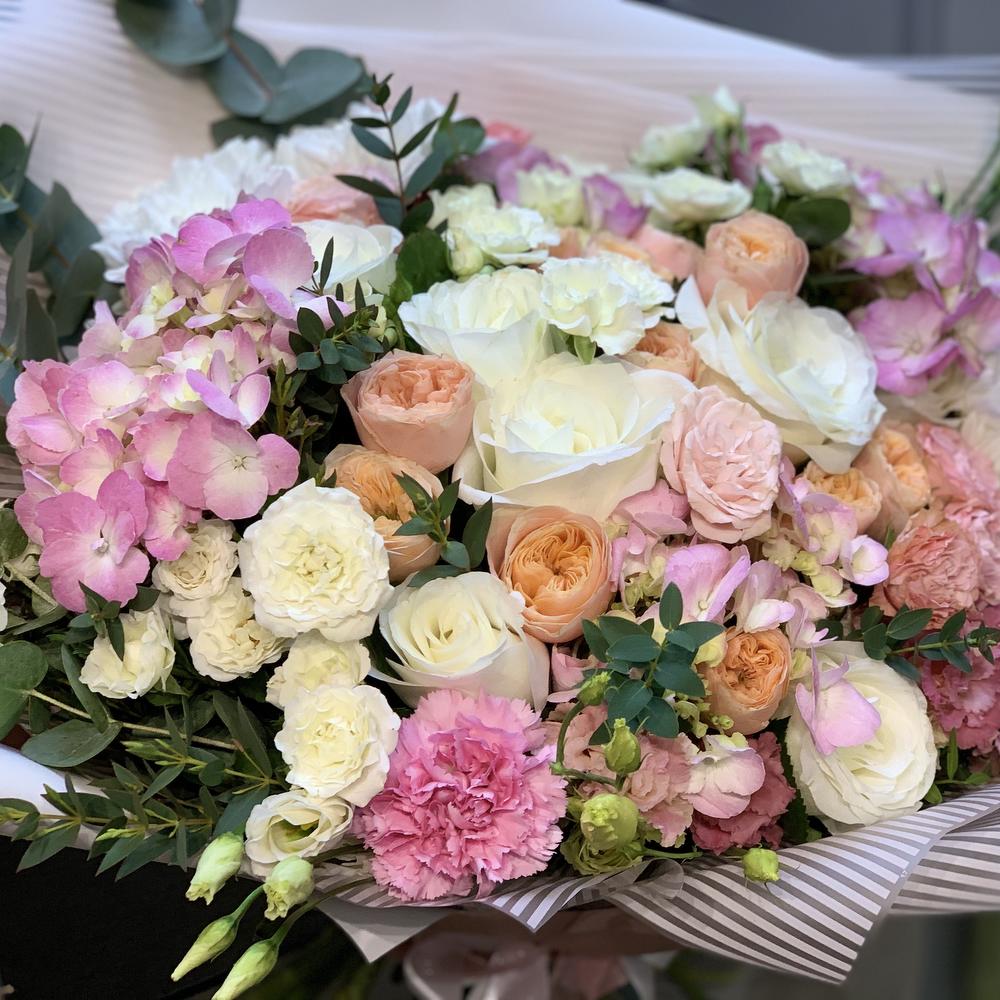 Гортензия – 2 шт.Роза пионовидная вувузела – 7 шт.Роза белая – 5 шт.Роза кустовая – 3 шт.Лизиантус – 3 шт.Гвоздика сортовая – 5 шт.Хризантема кустовая – 2 шт.Эвкалипт – 3 шт.Упаковка дизайнерская – 1 шт.Лента атласная – 1 шт.
